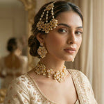 Discover the Amara Pink Choker Set, a captivating statement piece adorned with soothing rose quartz stones and dazzling cubic zirconia crystals. This elegant set includes matching drop earrings, a tikka, and a statement jhumar, designed to complement each other perfectly. Ideal for adding a refined touch to your traditional attire, the Amara Pink Choker Set blends timeless beauty with modern charm to make you stand out on any special occasion.