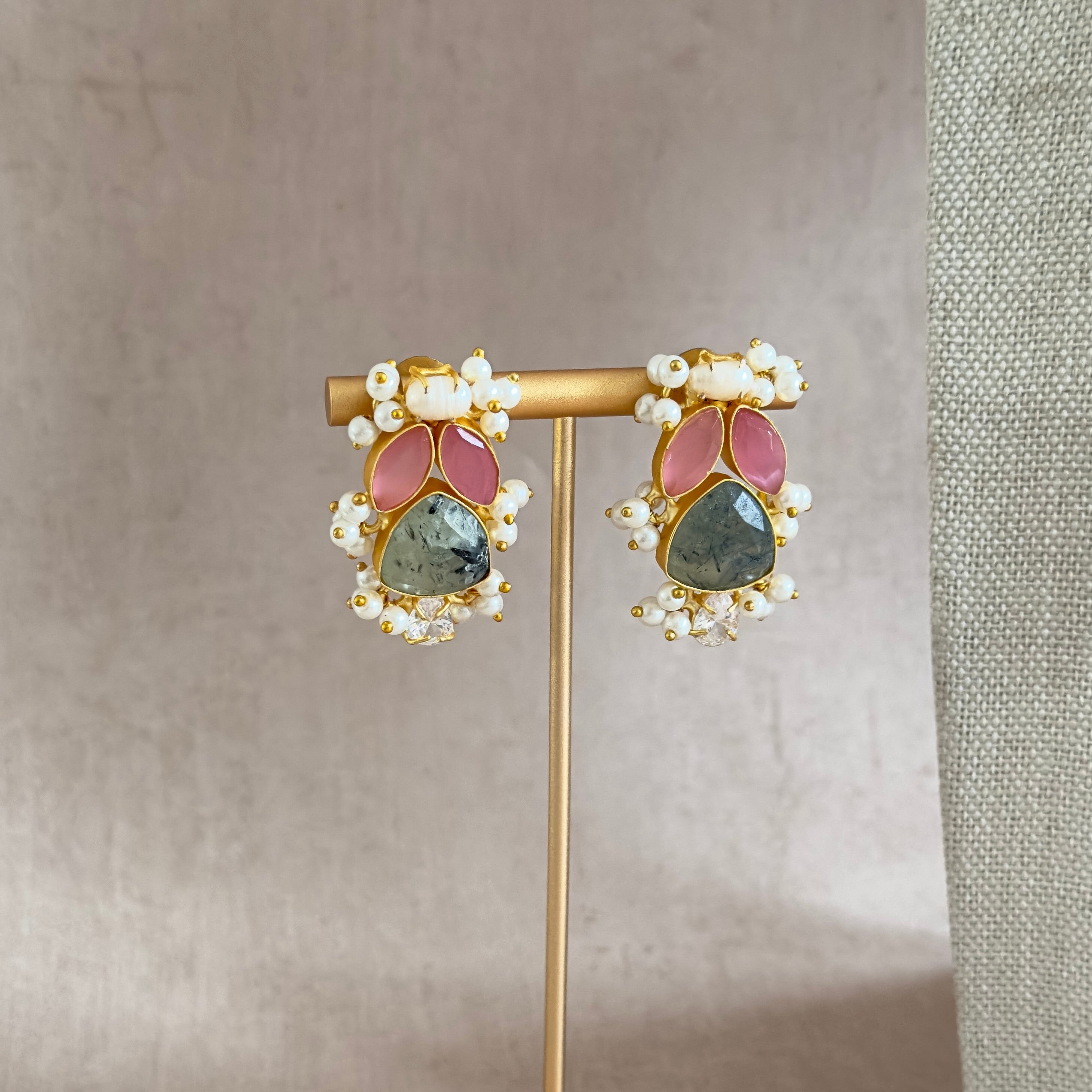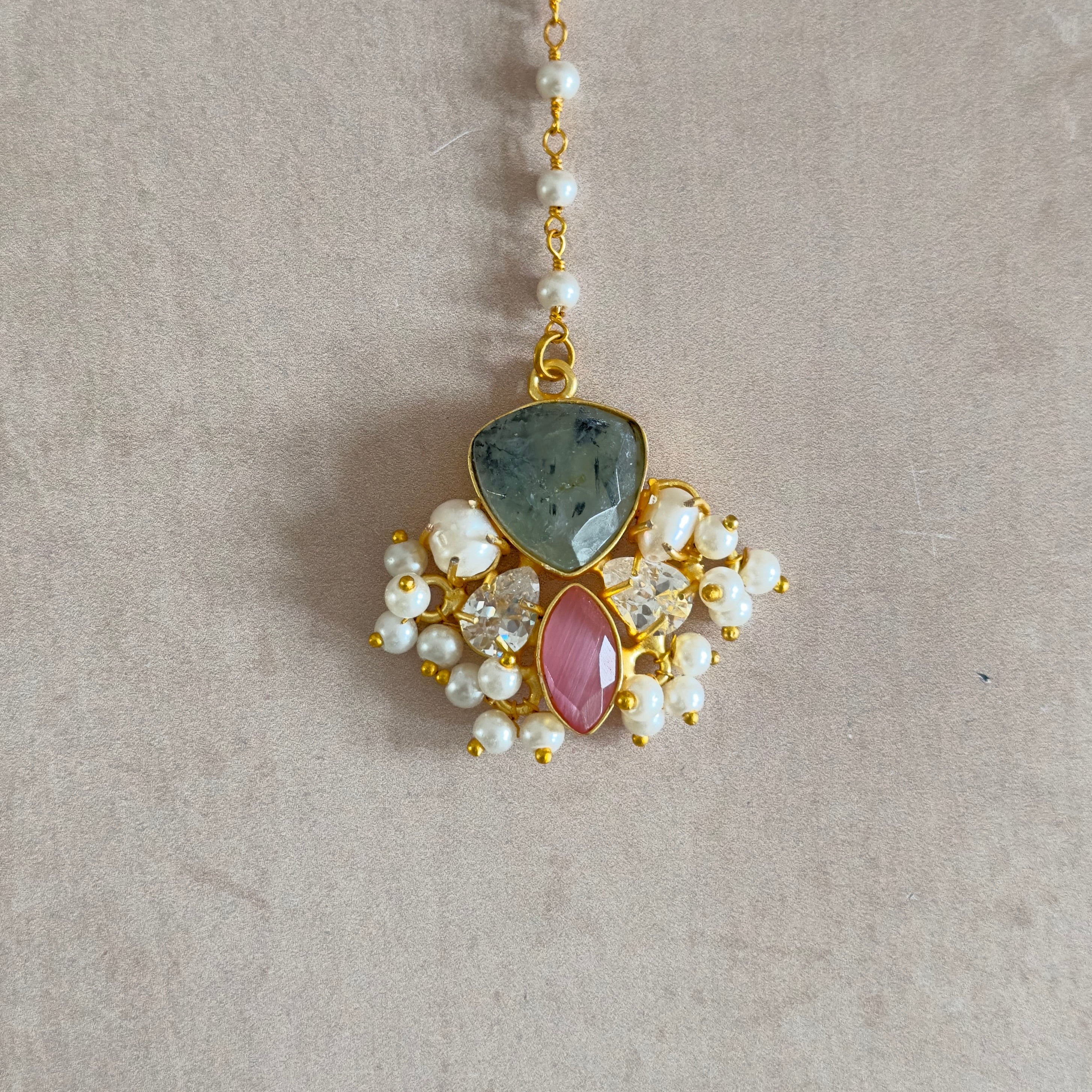 Elevate your elegance with the Giselle Olive Pink Choker Set, featuring stunning hues of green prehnite and pink monalisa stone, enhanced by sparkling cubic zirconia crystals and delicate pearl accents. This exquisite set includes matching stud earrings and a tikka, perfectly designed to add a touch of sophistication to any outfit. Ideal for special occasions.
