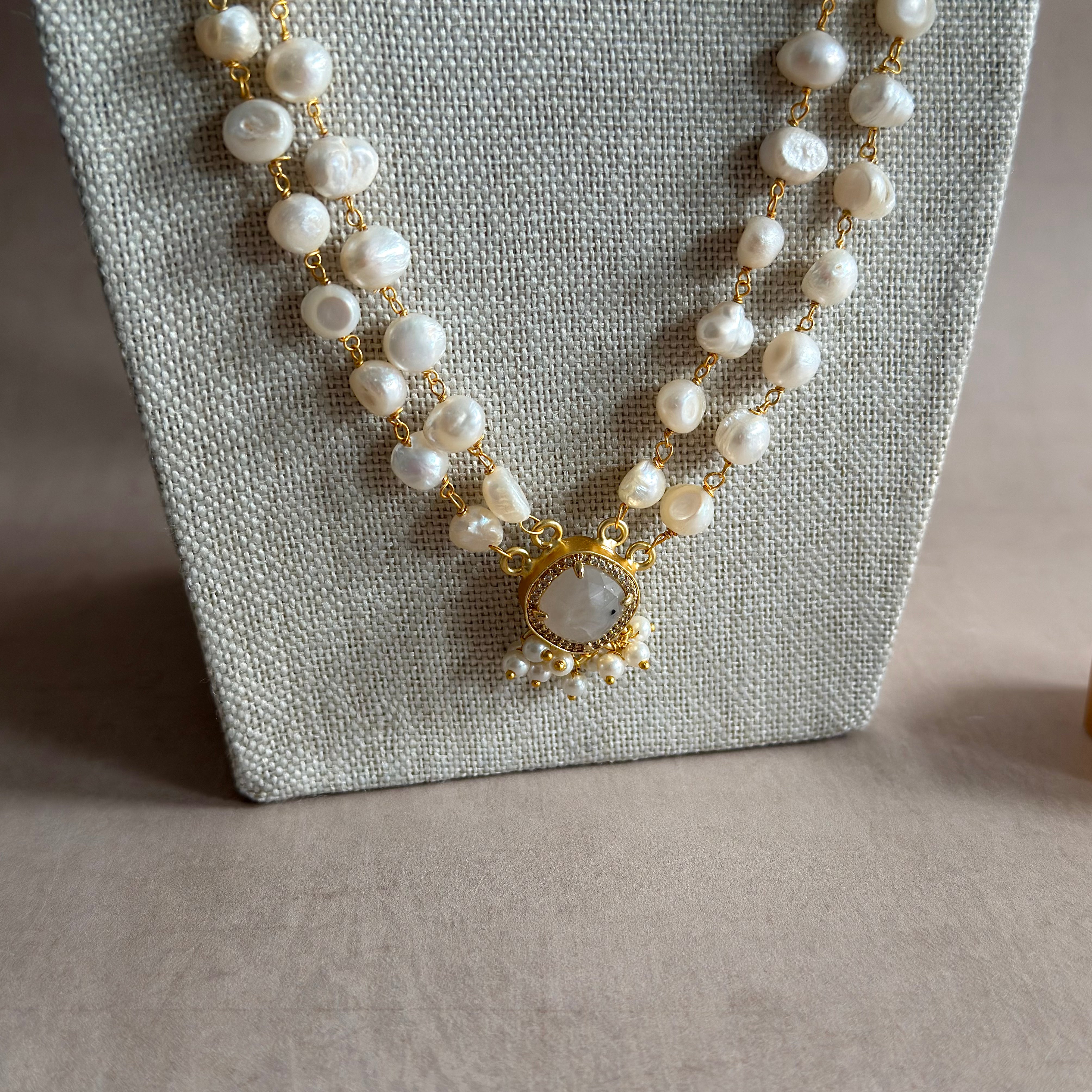 Add a touch of timeless elegance to your outfit with our Layali White Pearl Mala Necklace Set. Each piece features lustrous white quartz and pearls for a classic look. The set comes with matching stud earrings for a complete and sophisticated ensemble.