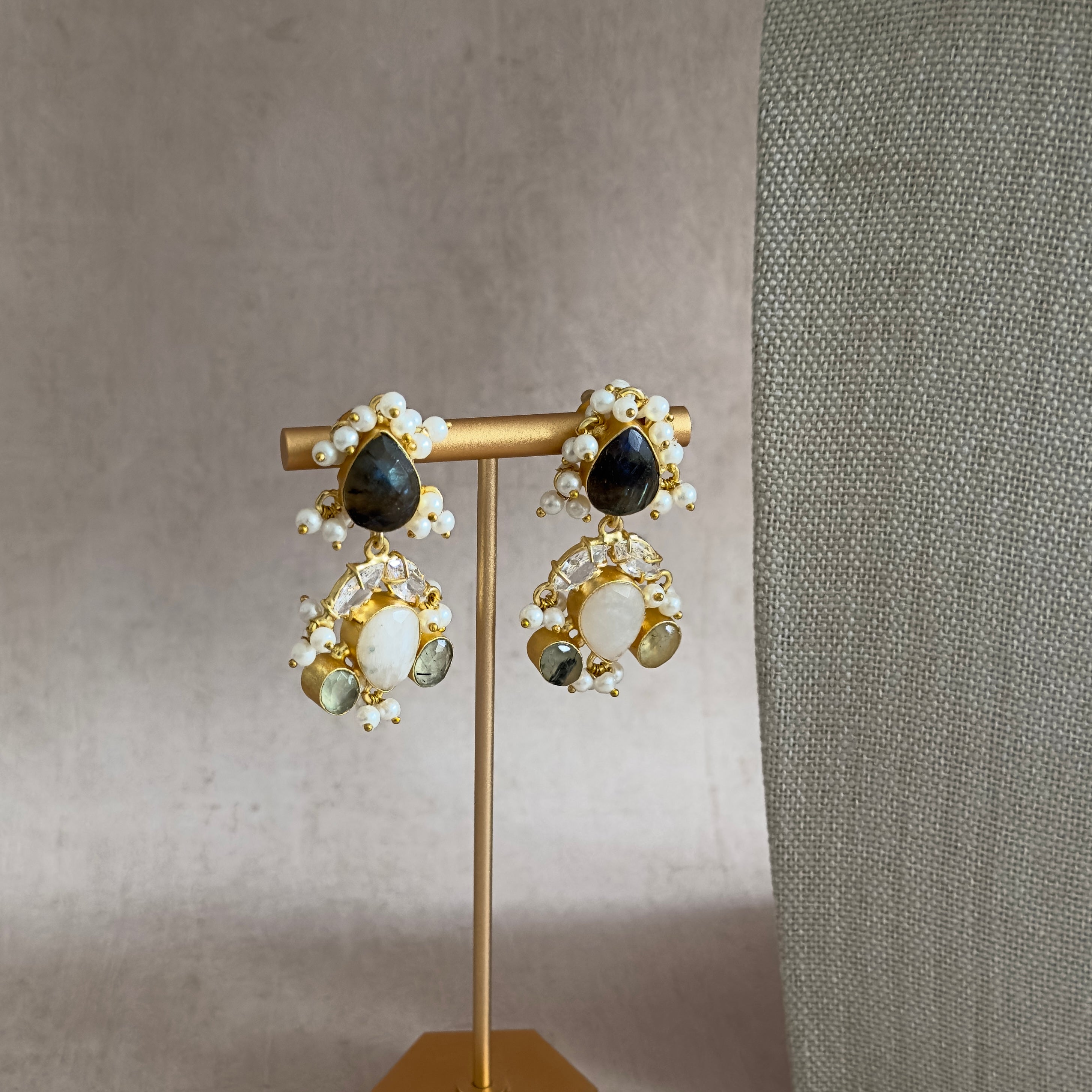 Elevate your elegance with the Nawal White Choker Set, featuring stunning hues of white moonstone and labradorite. This exquisite combination casts a captivating glow, perfect for adding a touch of sophistication to any occasion. The set includes matching drop earrings and a tikka, seamlessly coordinating to enhance your look with grace and charm.