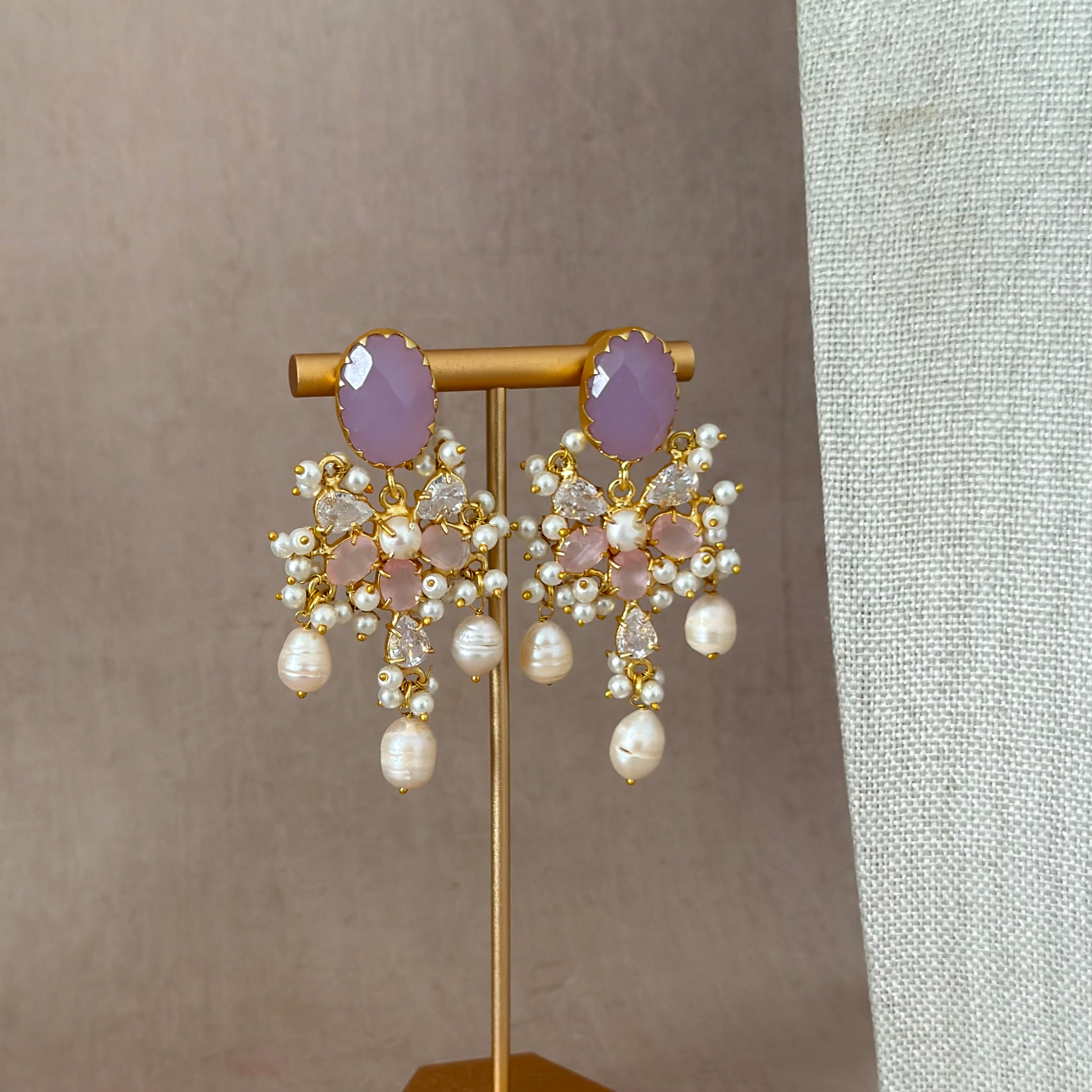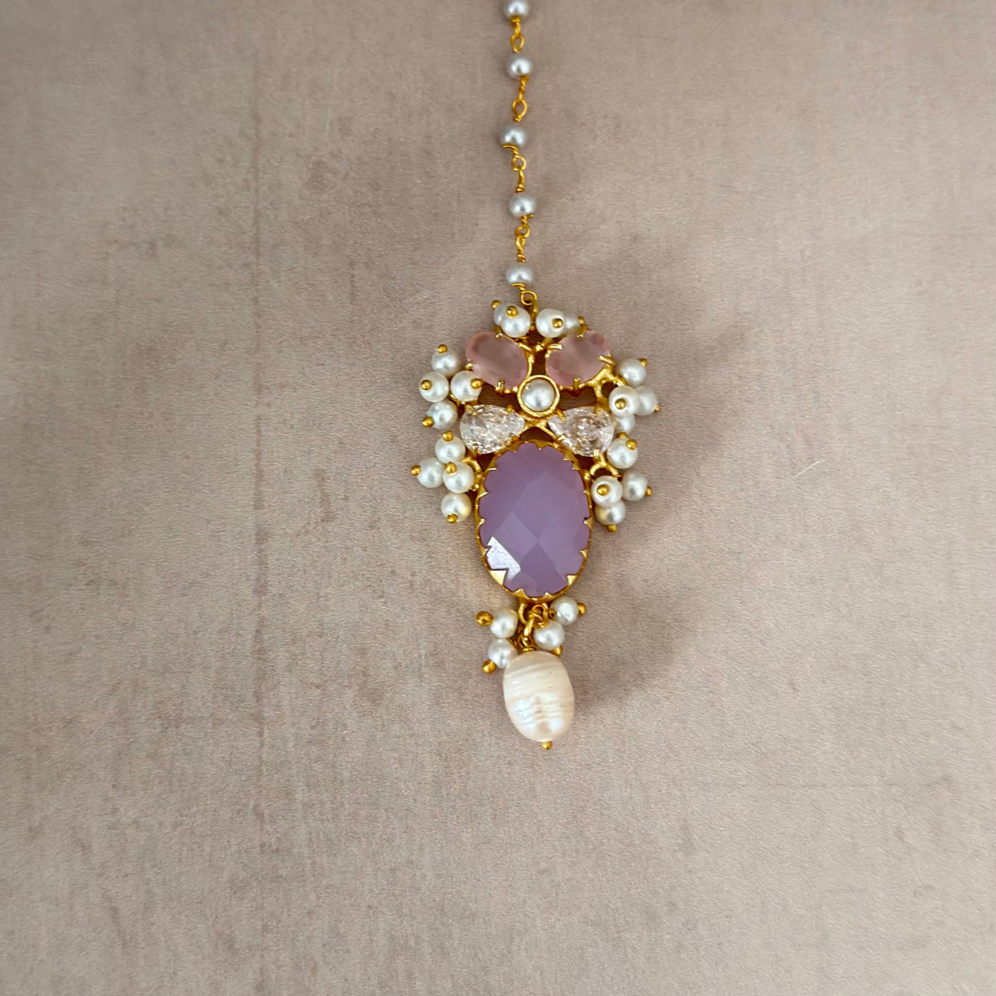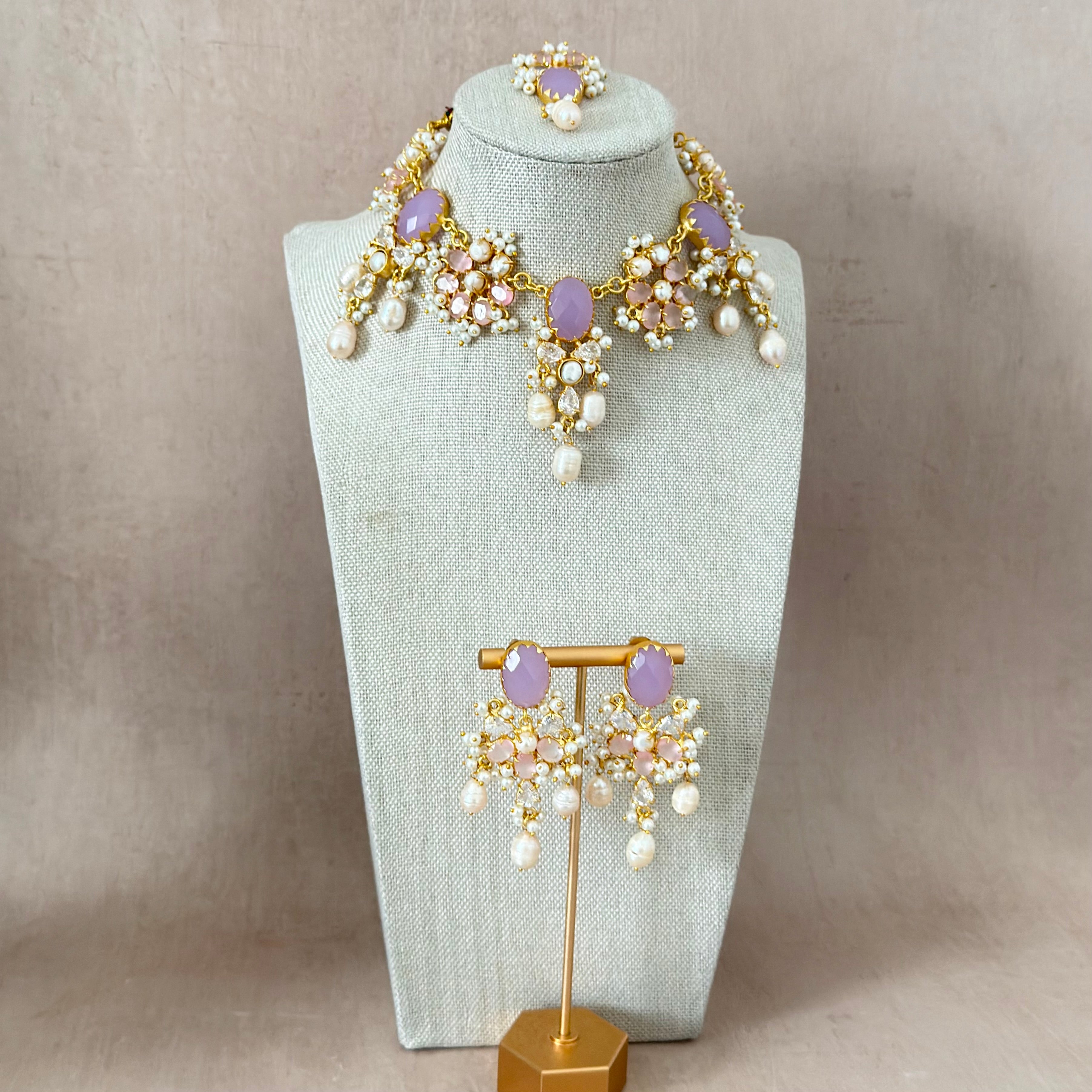 The Lilac Pearl Necklace Set brings together pearls, lilac and pink hues in one cohesive design. This three-piece ensemble features a striking statement necklace paired with coordinating drop earrings and a tikka, creating a complete look that works beautifully for formal occasions. Discover our new jewellery collection that combines natural beauty with understated sophistication.
