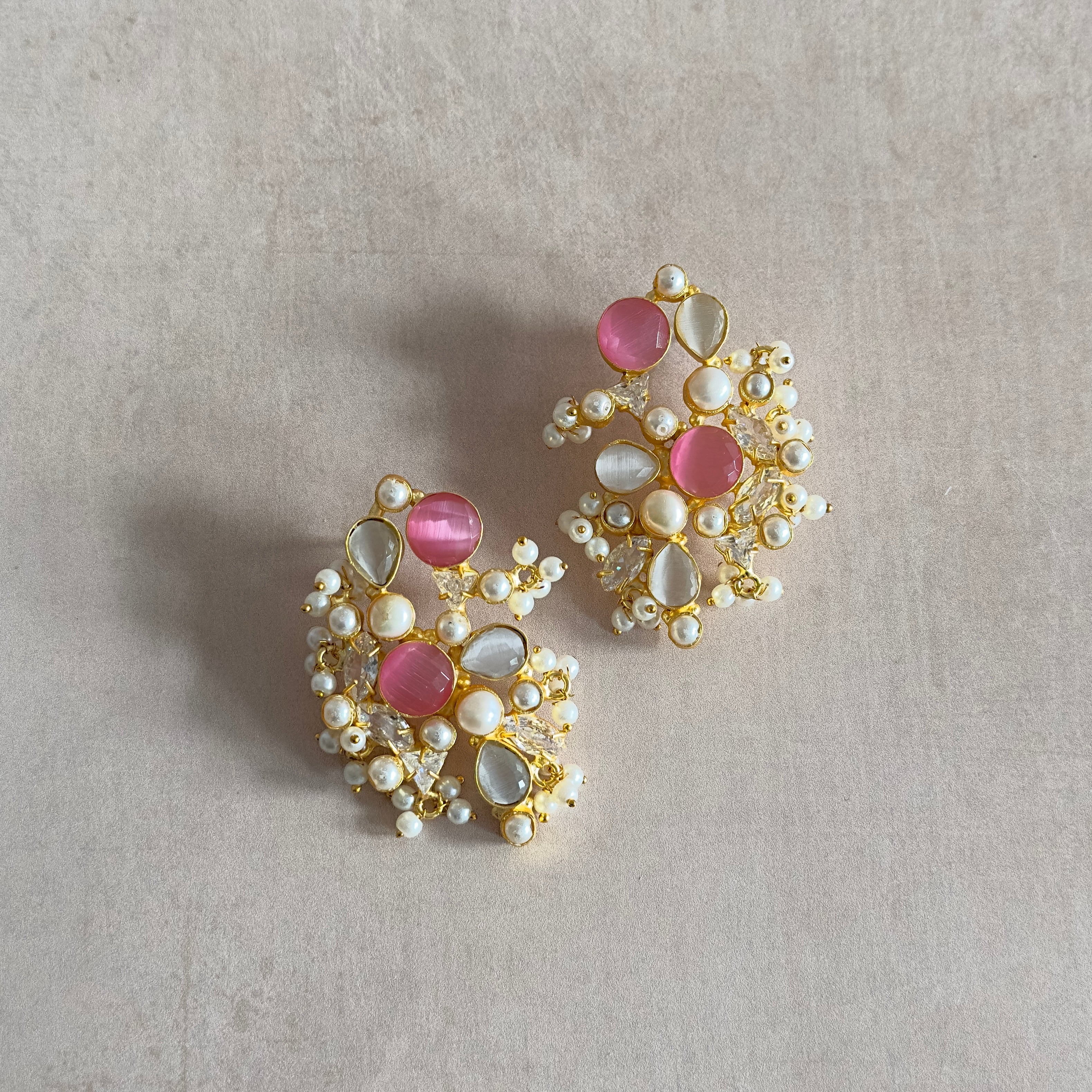 Experience the enchanting blend of grey and pink monalisa stones with shimmering pearls. These statement stud earrings add a striking touch of elegance, perfect for elevating your ensemble.