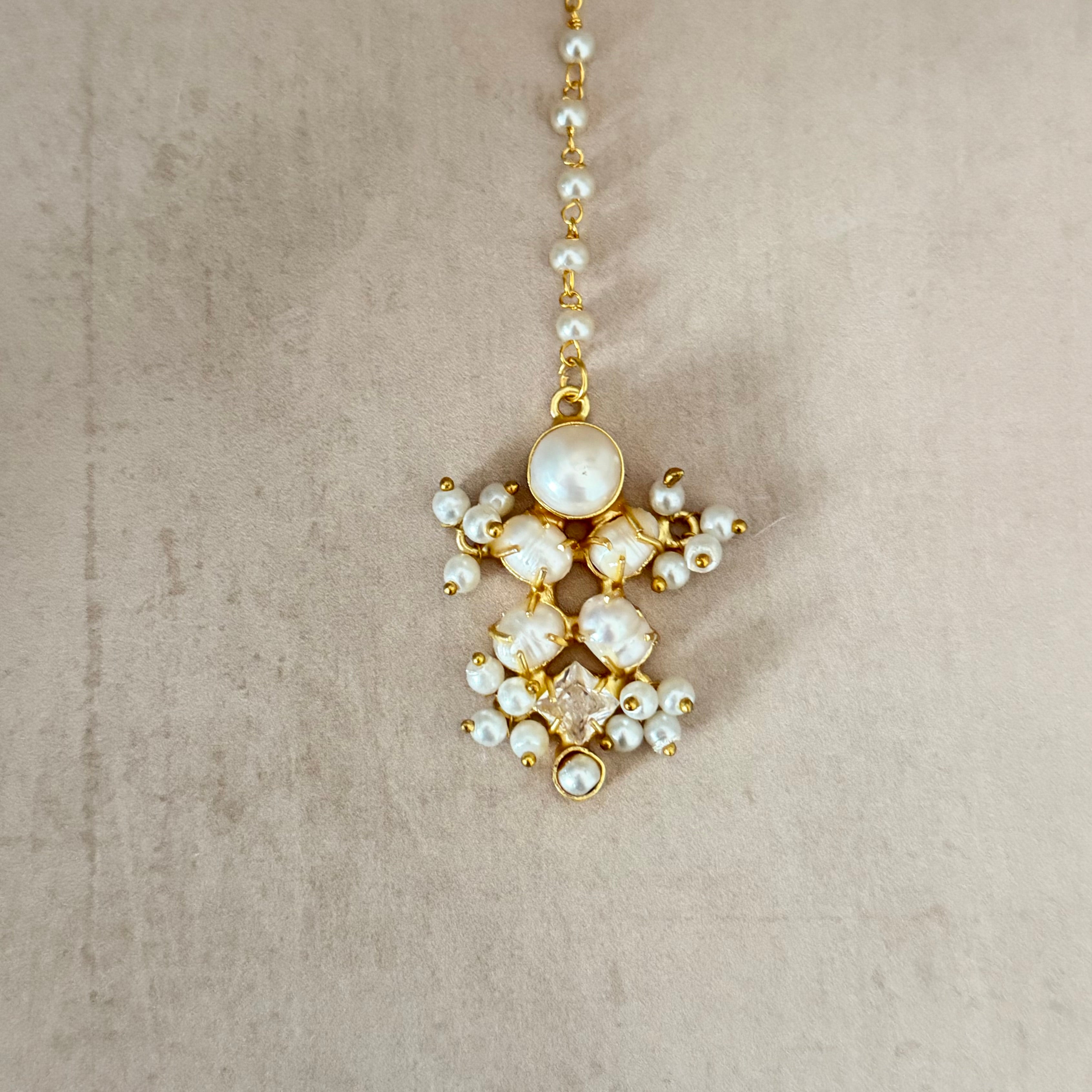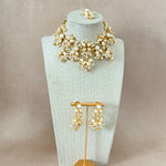 Make a striking impression with the Areeba Pearl Crystal Choker Set, a luxurious three piece ensemble designed to elevate any occasion. This statement choker features lustrous pearls and striking sparkling cubic zirconia crystals that catch the light beautifully. The set includes matching drop earrings and an elegant tikka, creating a sophisticated look. Perfect for formal occasions.