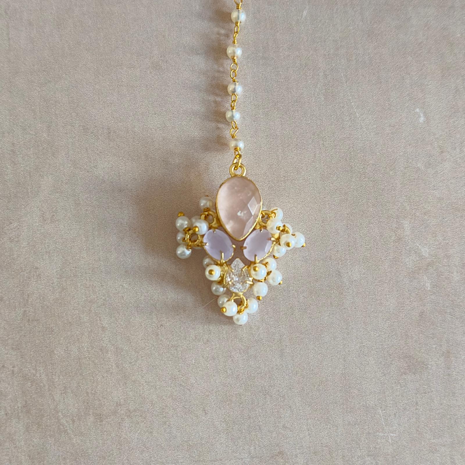 Elevate your elegance with the Eliana Pink Pearl Necklace Set, featuring hues of pink and delicate lilac stones, beautifully complemented by lustrous freshwater pearls and sparkling cubic zirconia crystals. This exquisite set includes matching drop earrings, and tikka, perfectly designed to add a graceful touch to any special occasion.