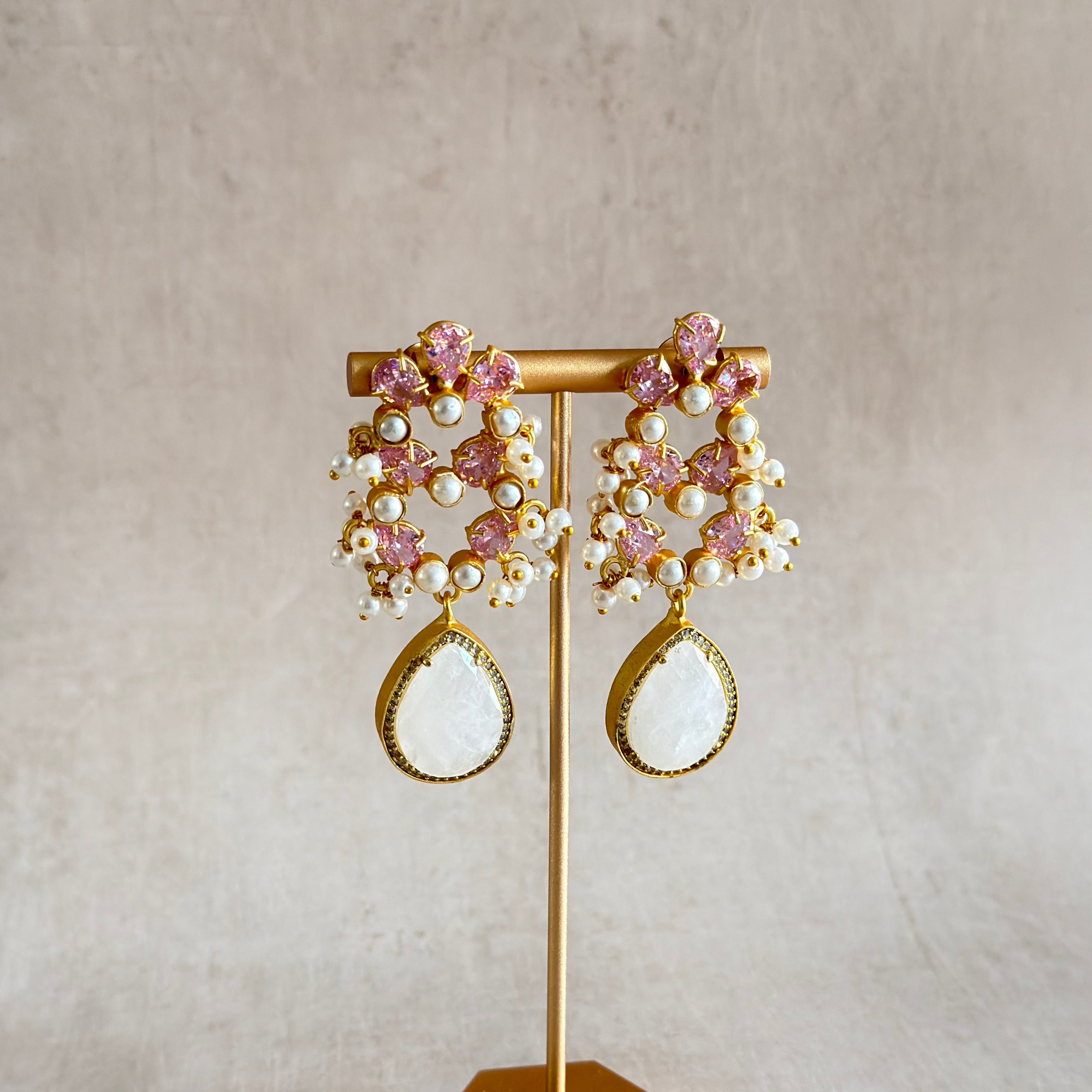 Turn heads with the Kenzie White Crystal Drop Earrings, featuring dazzling pink cubic zirconia crystals and serene white quartz stones that sparkle with timeless elegance.