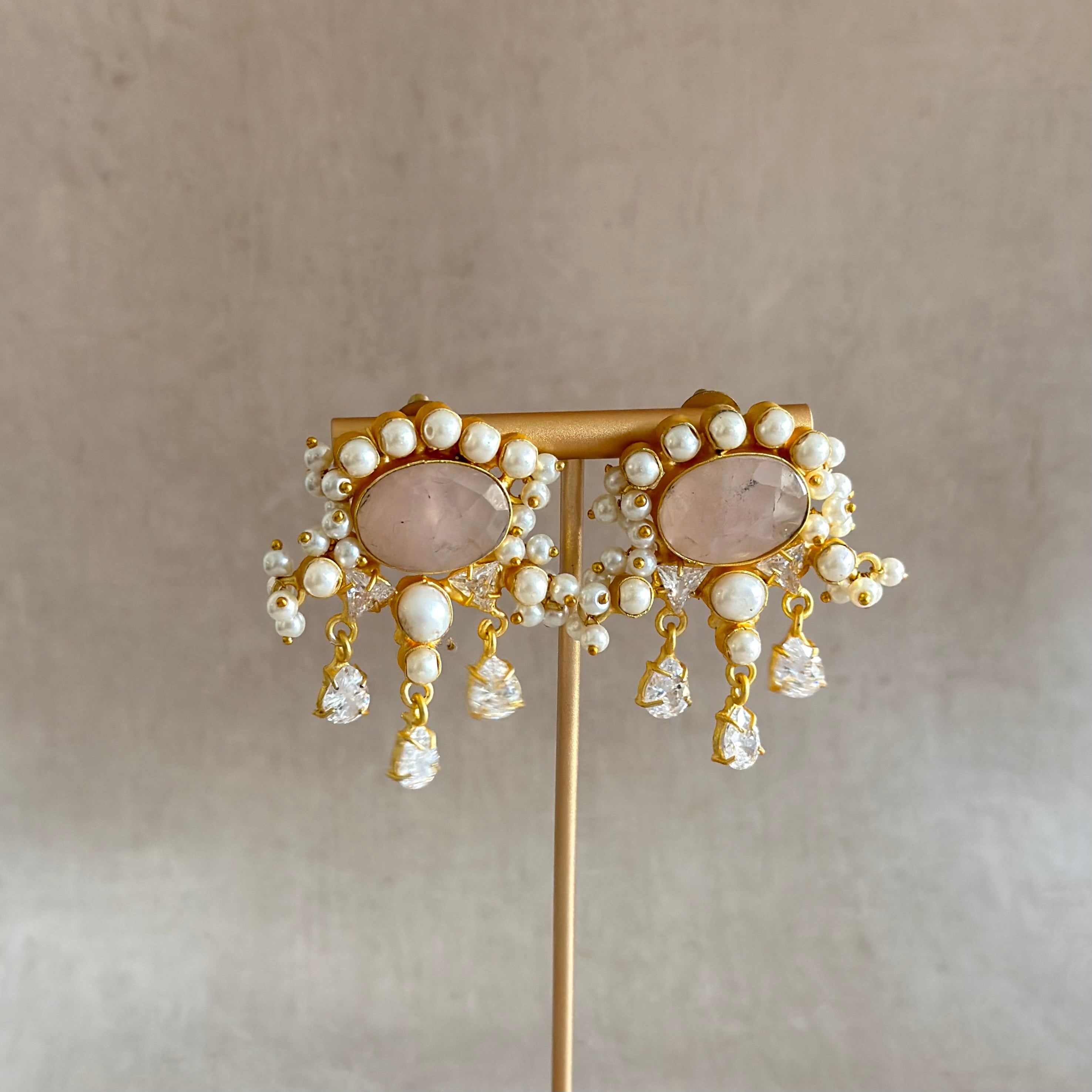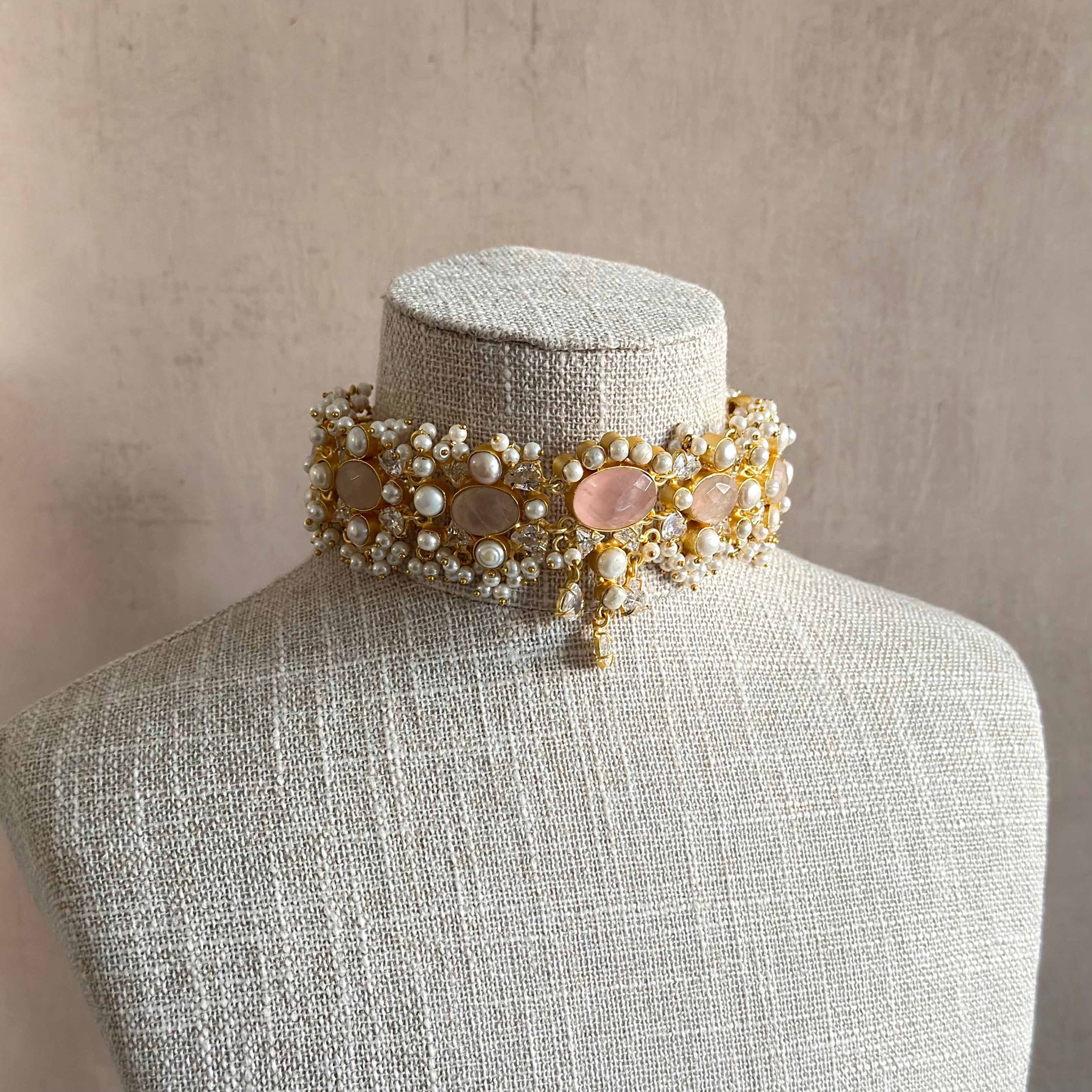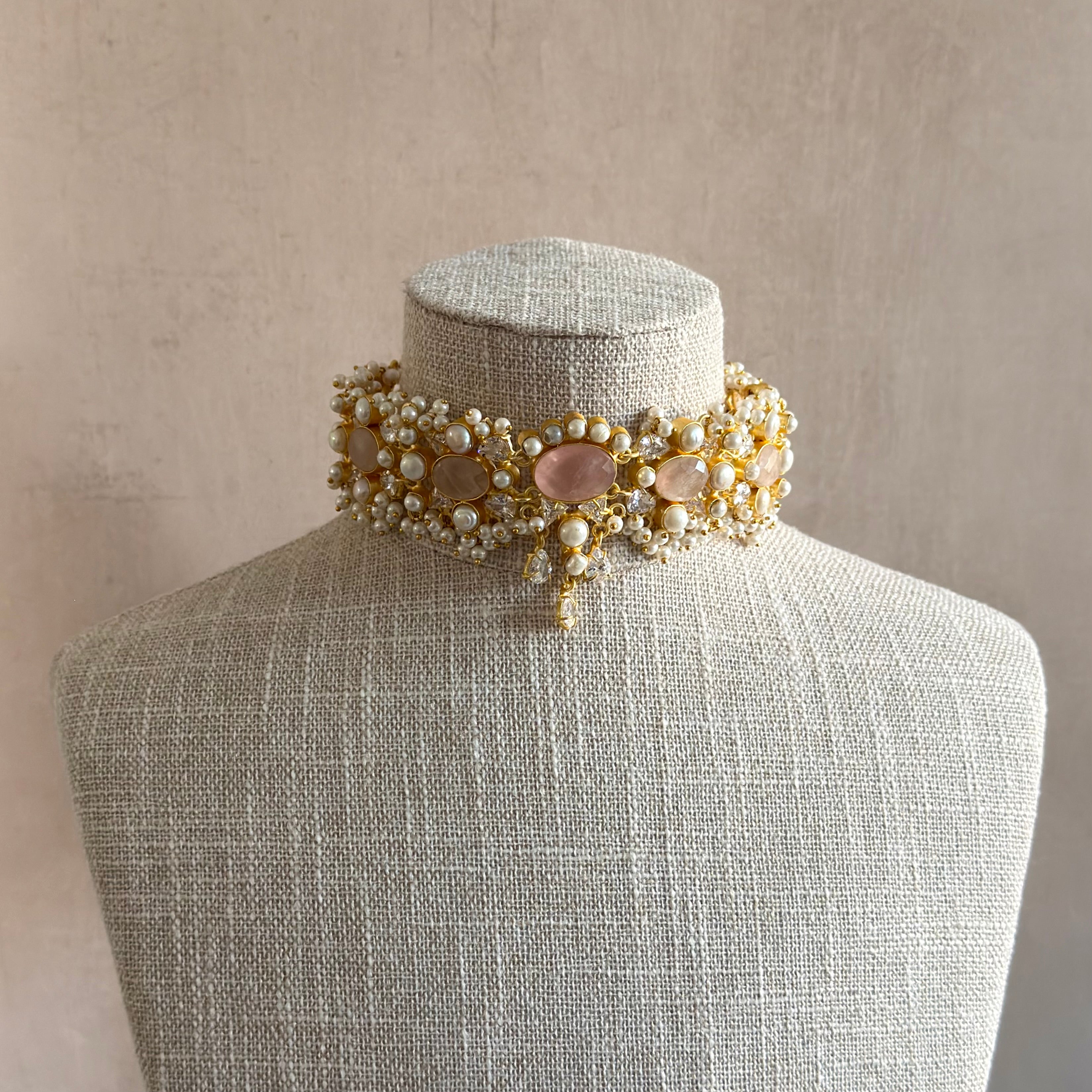 Elevate your look with the Khawla Pink Pearl Choker Set, a stunning three piece jewellery set designed to turn heads. This exquisite set features a statement choker adorned with soft rose quartz stone and shimmering cubic zirconia crystals, that catch the light beautifully. Paired with matching stud earrings and a tikka, this statement choker set offers effortless glamour, perfect for weddings, celebrations, and special occasions.