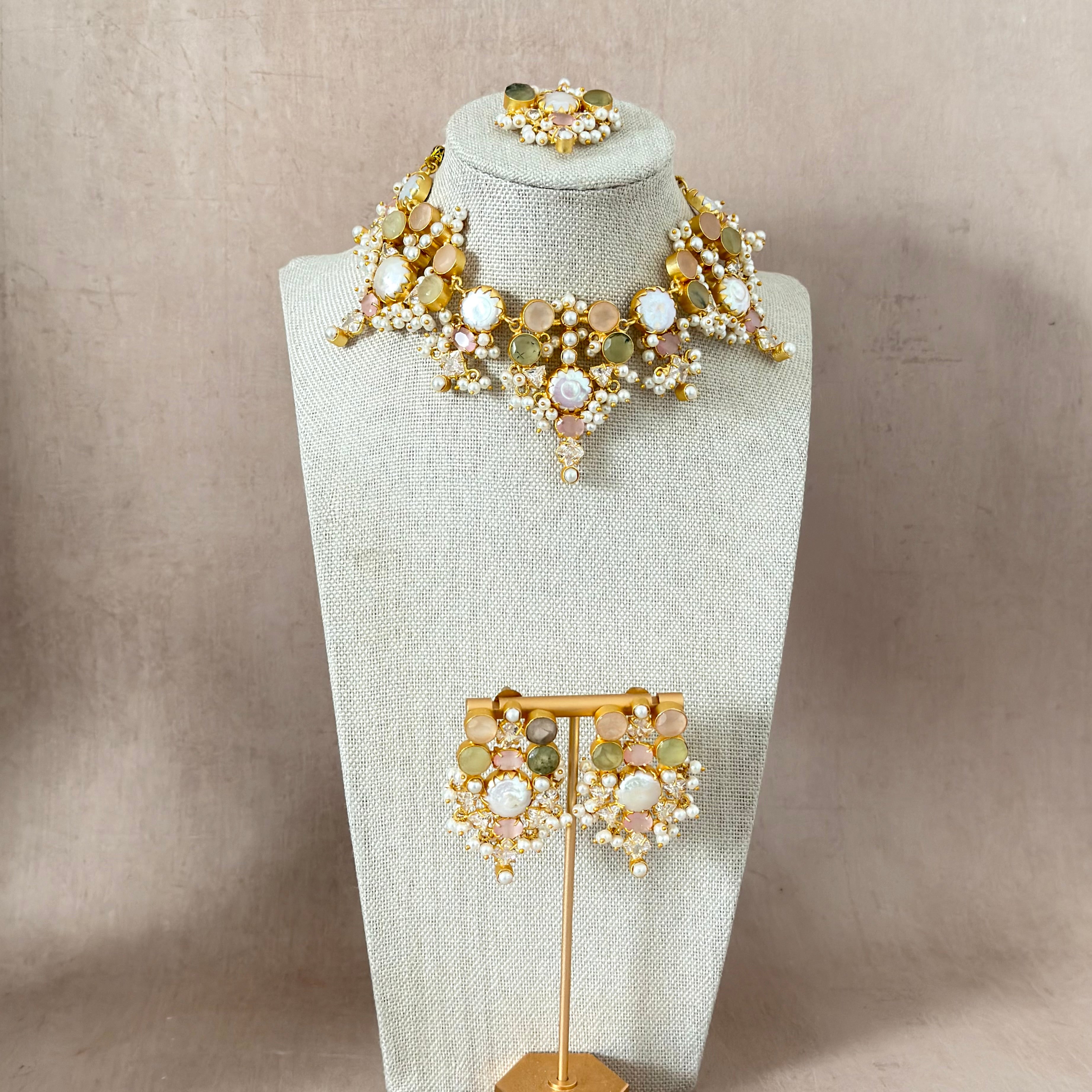 Discover the Leona Rose Pearl Crystal Necklace Set, a stunning new three piece set, featuring lustrous pearls with soft hues of rose quartz and prehnite stone embellished with brilliant cubic zirconia crystals. Perfect for any occasion.