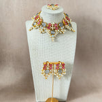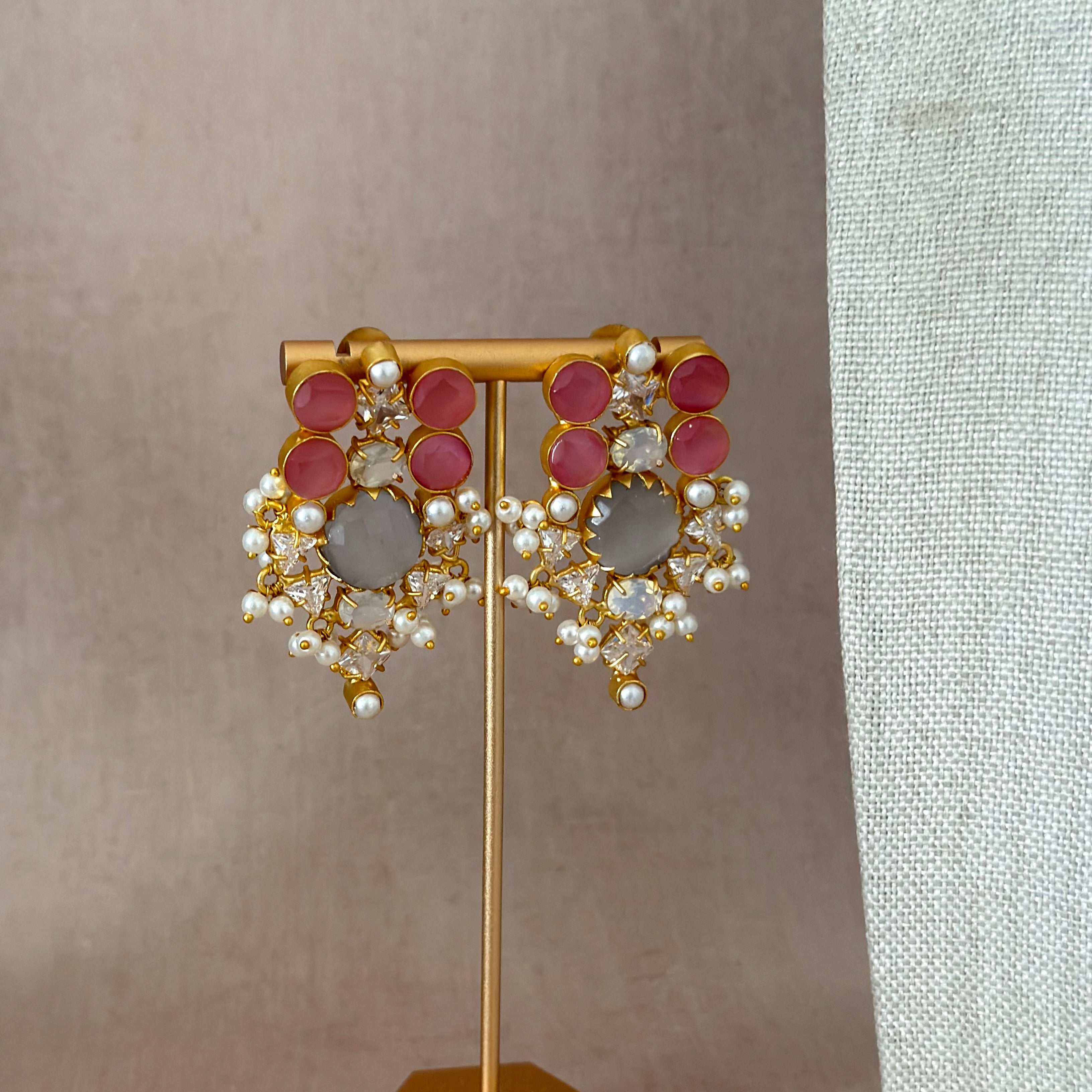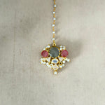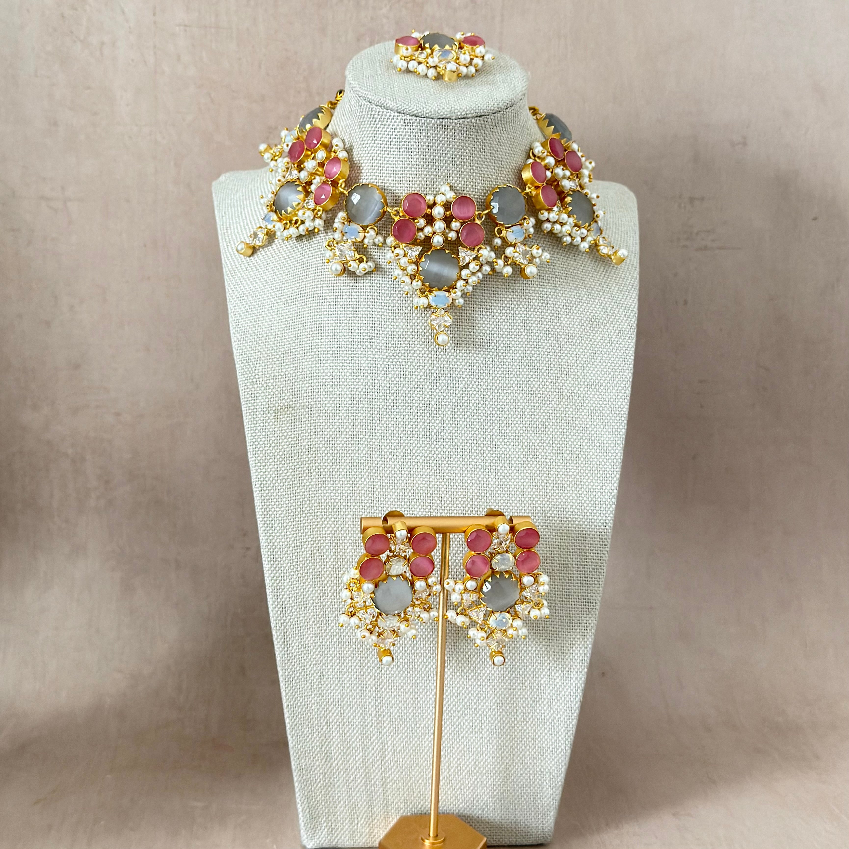 Elevate your jewellery collection with this stunning statement set featuring grey monalisa stones paired with shimmering pink monalisa and delicate opalite accents. This versatile ensemble combines a striking necklace with matching stud earrings and an ornate tikka, perfect for adding a touch of elegance to any occasion.