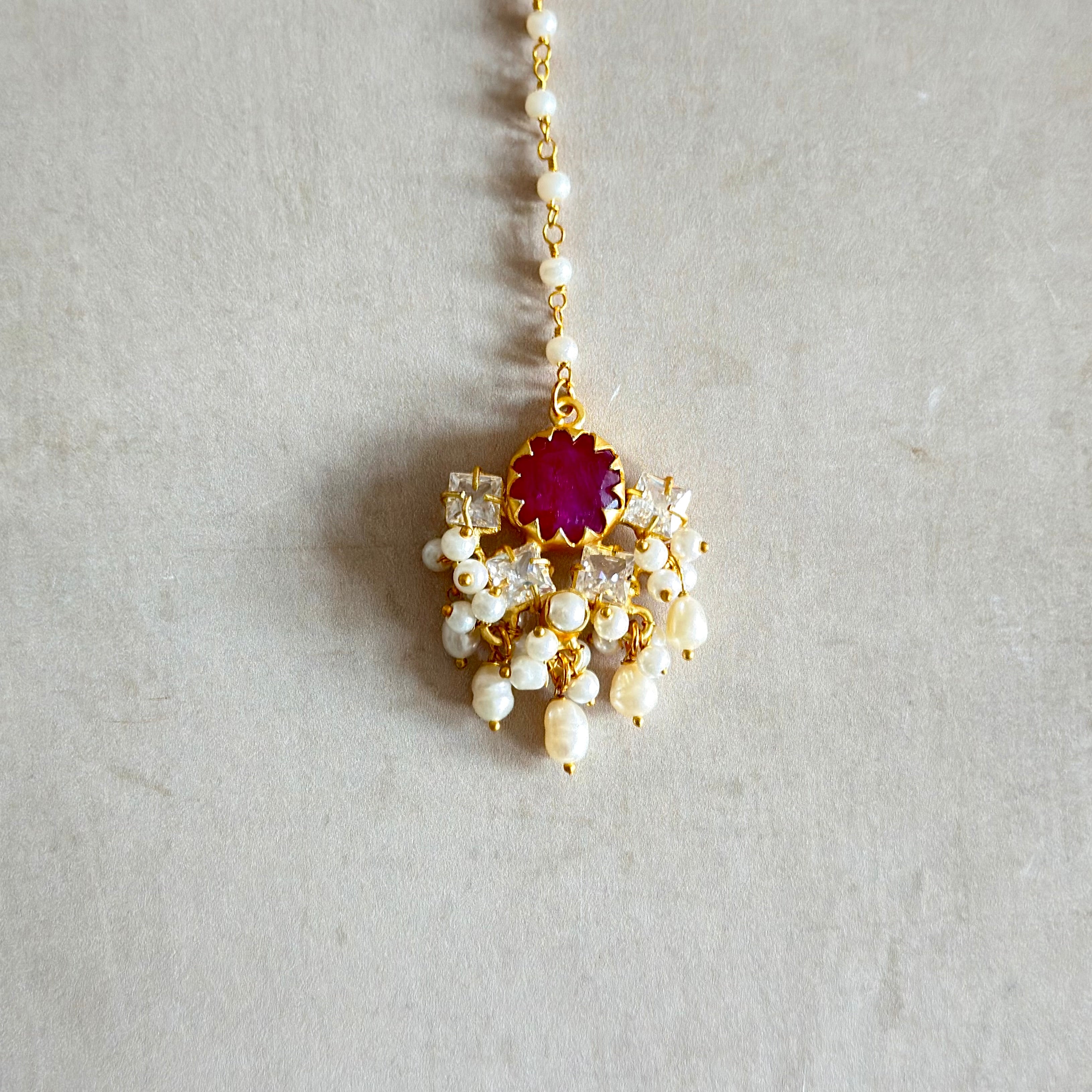 Elevate your look with the Maliha Maroon Pearl Choker Set, a stunning three piece jewellery set designed to turn heads. This exquisite set features a choker adorned with lustrous baroque pearls, ruby corundum and shimmering cubic zirconia crystals. Paired with matching stud earrings and a tikka, this statement set offers effortless glamour for weddings, celebrations, and special occasions.