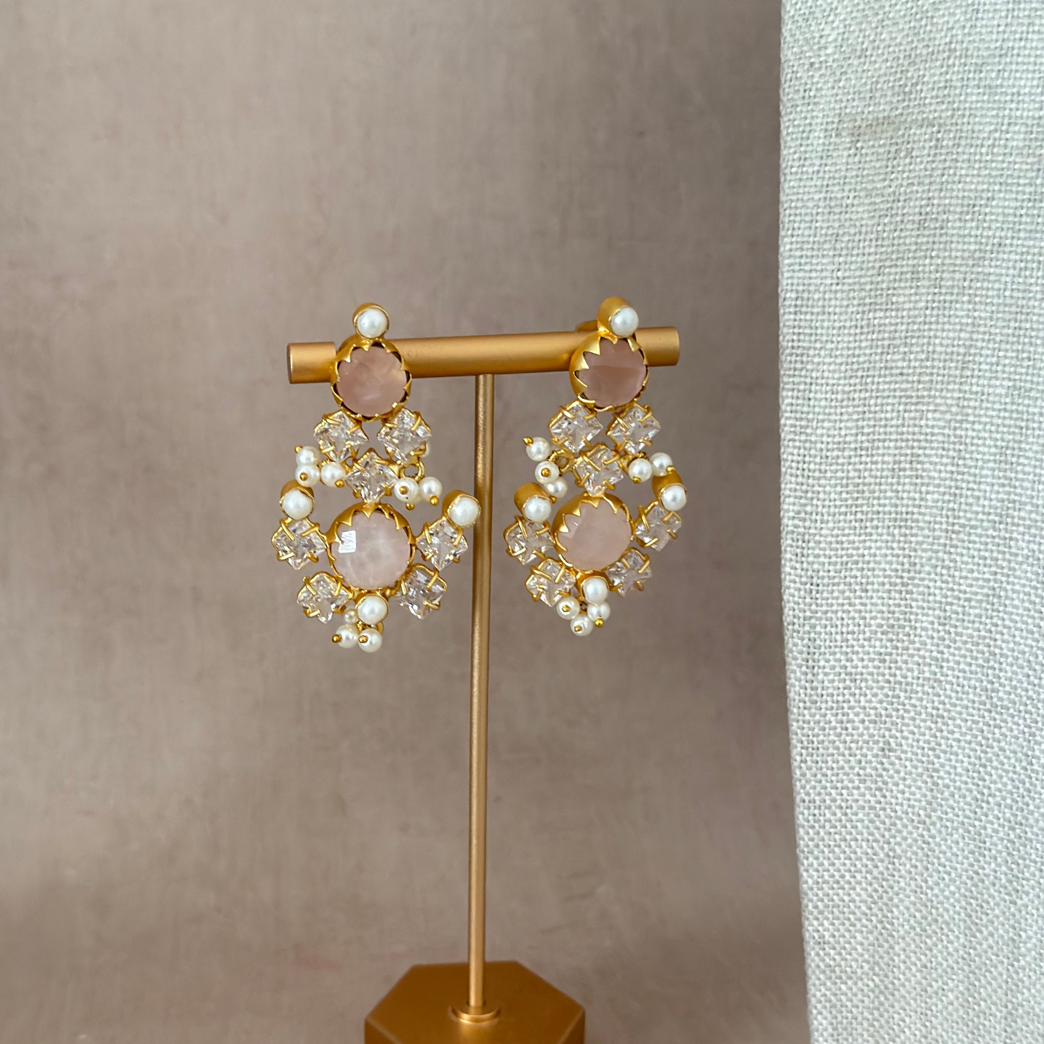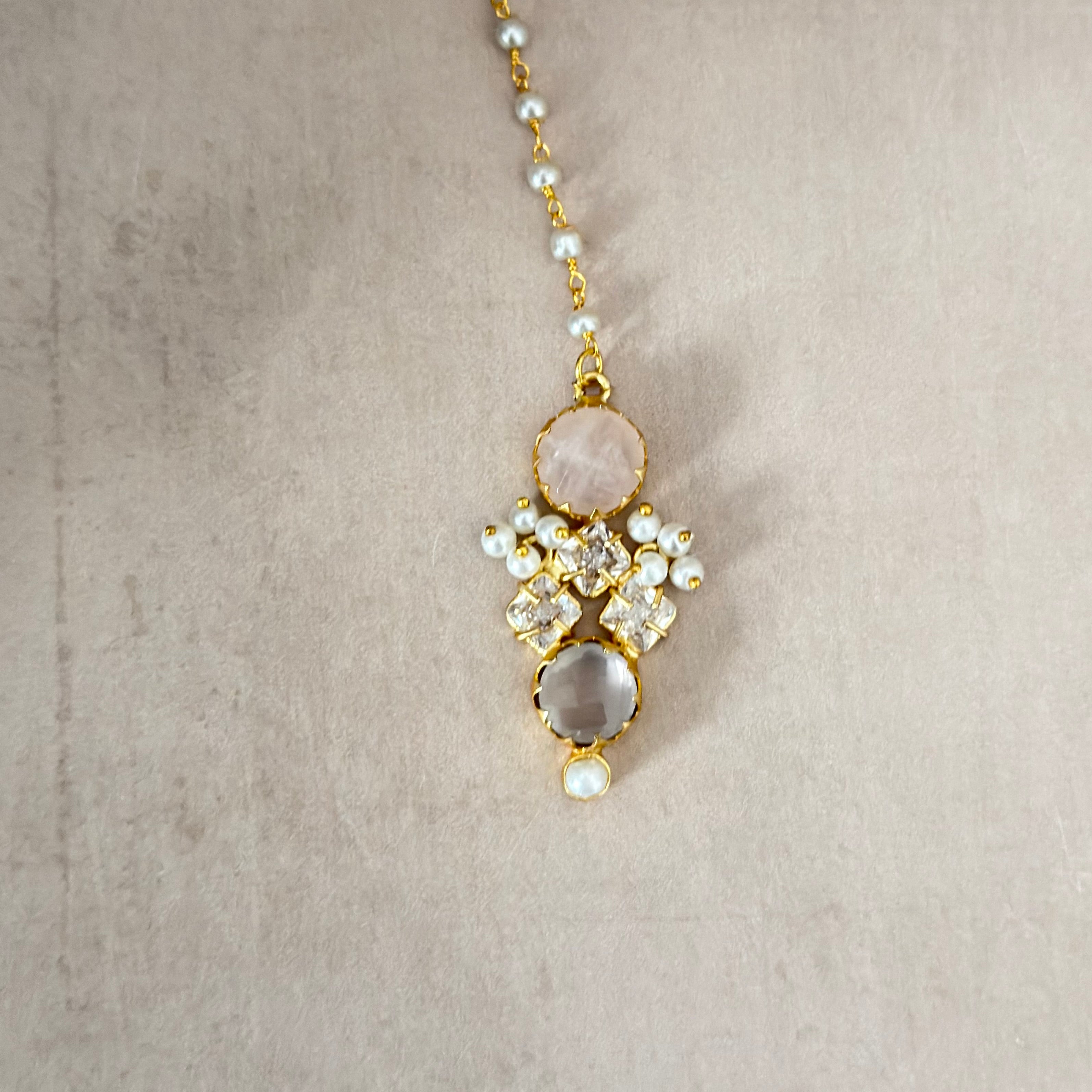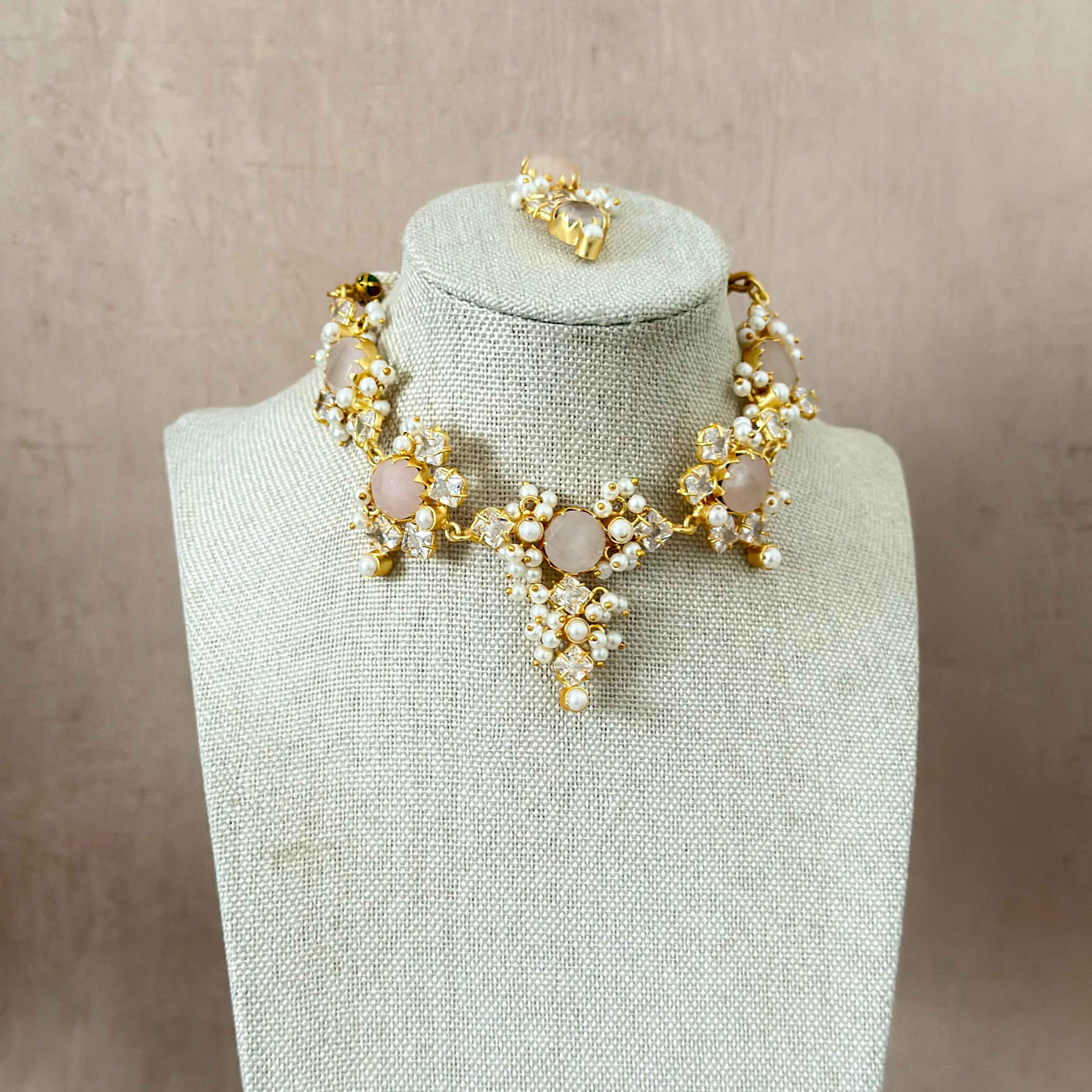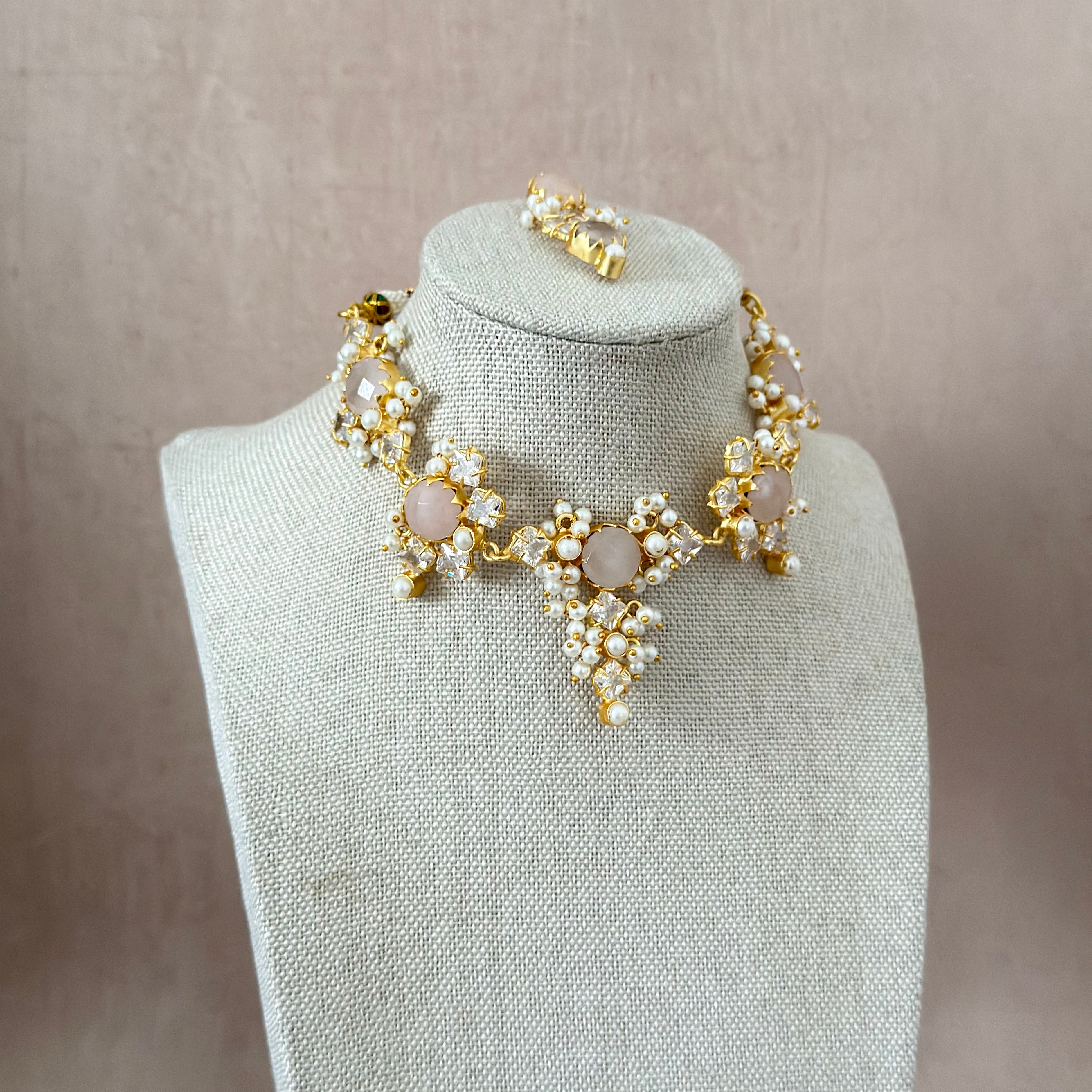 The Rose Crystal Choker Set brings together natural quartz with sparkling cubic zirconia crystals. Complete with a choker, stud earrings, and tikka, this three-piece set delivers sophisticated style for every celebration.