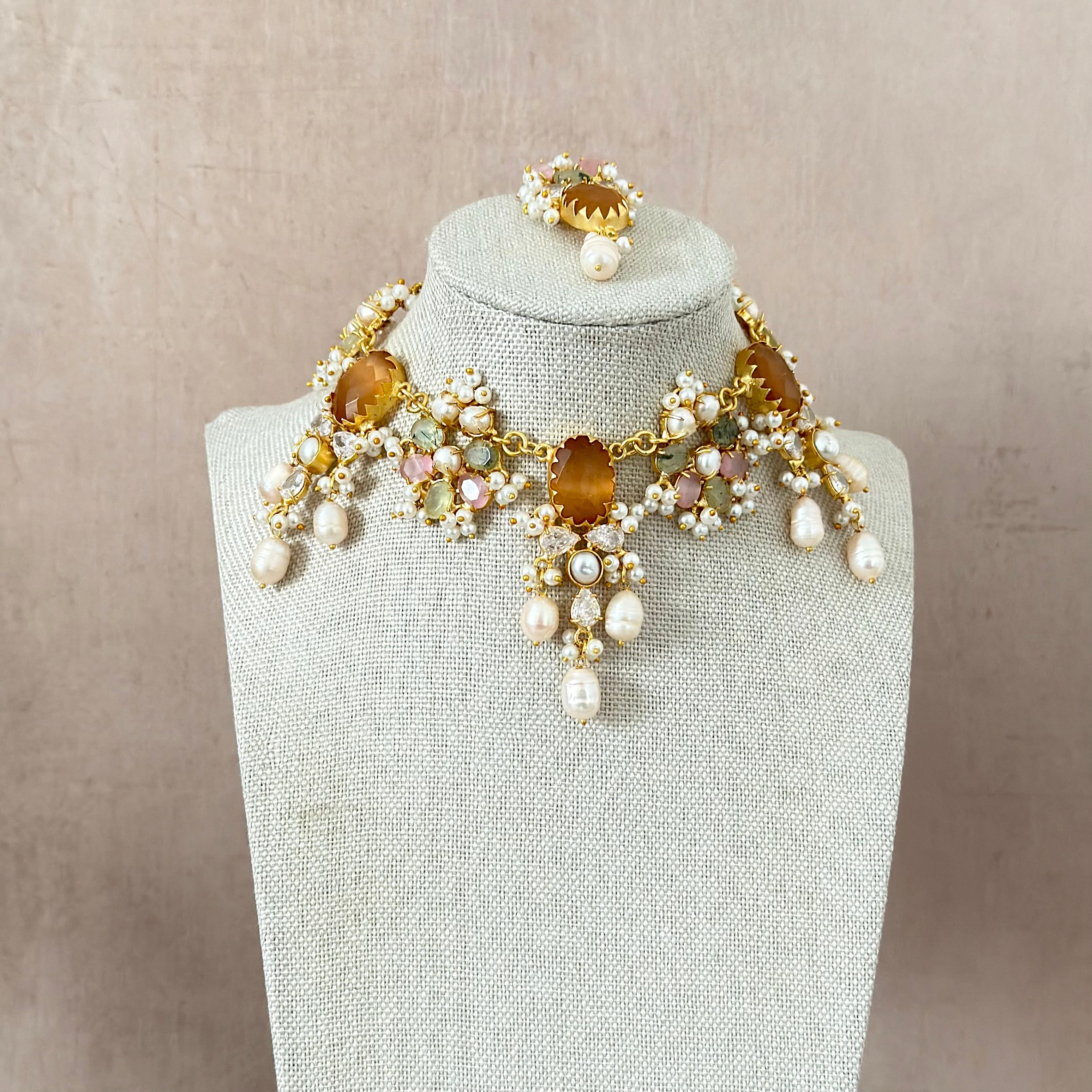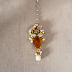 The Amber Pearl Necklace Set brings together pearls with amber, prehnite and pink hues in one stunning design. This three piece ensemble features a striking statement necklace paired with coordinating drop earrings and a tikka, creating a complete look that works beautifully for formal occasions. Discover our new jewellery collection that combines natural beauty with understated sophistication.