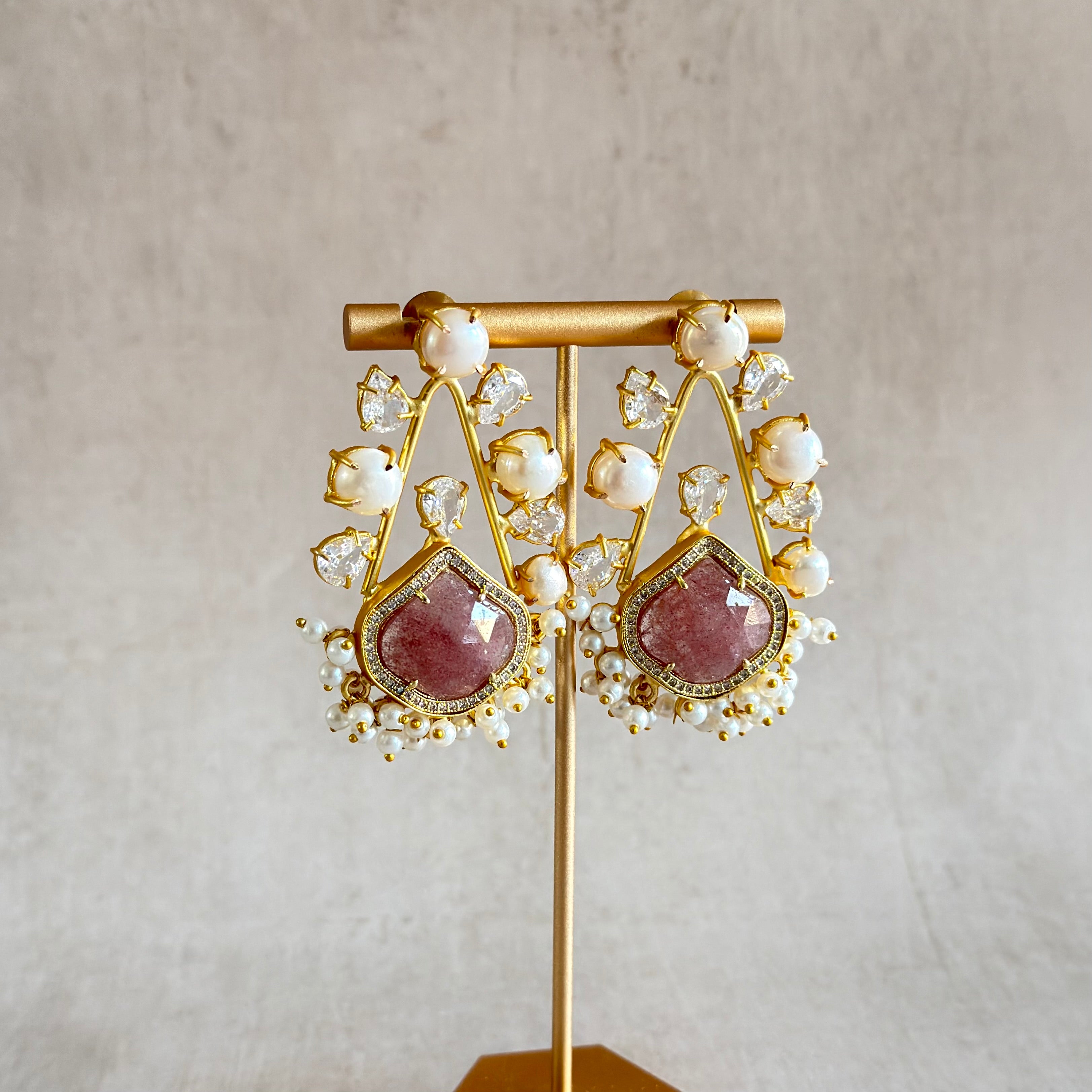 Make a statement with the Zohra Pearl Stud Earrings. These charming studs combine lustrous pearls, sparkling crystals, and warm rustic pink stones for effortless elegance. Perfect for any occasion.