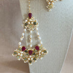 Elevate your elegance with the Antonia Fuchsia Choker Set, featuring a statement necklace adorned with deep ruby corundum, serene prehnite, and lustrous pearls. This exquisite set includes matching stud earrings, a tikka, and a statement jhumar headpiece, offering a complete look perfect for special occasions. Each piece harmoniously blends rich hues and textures to enhance your ensemble.