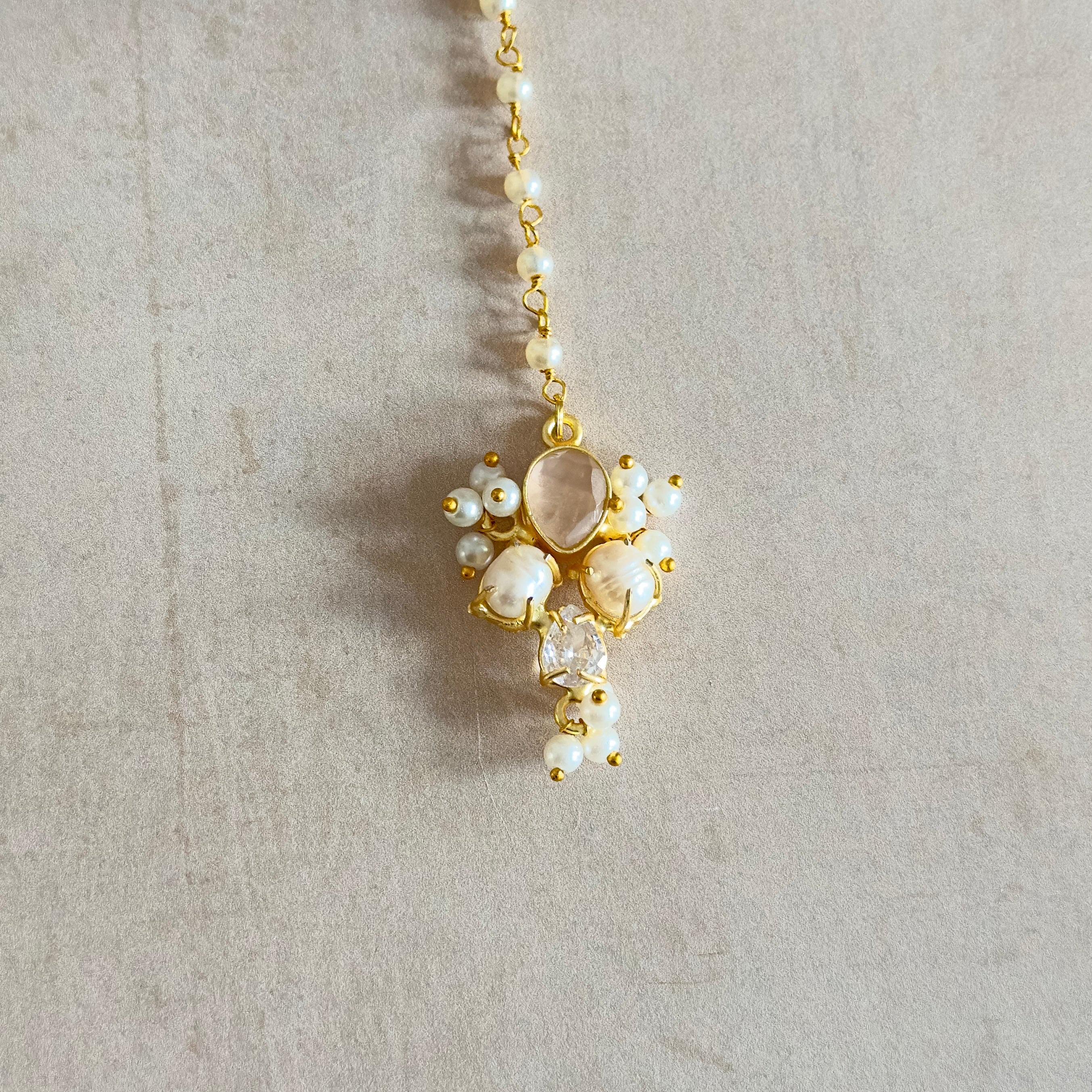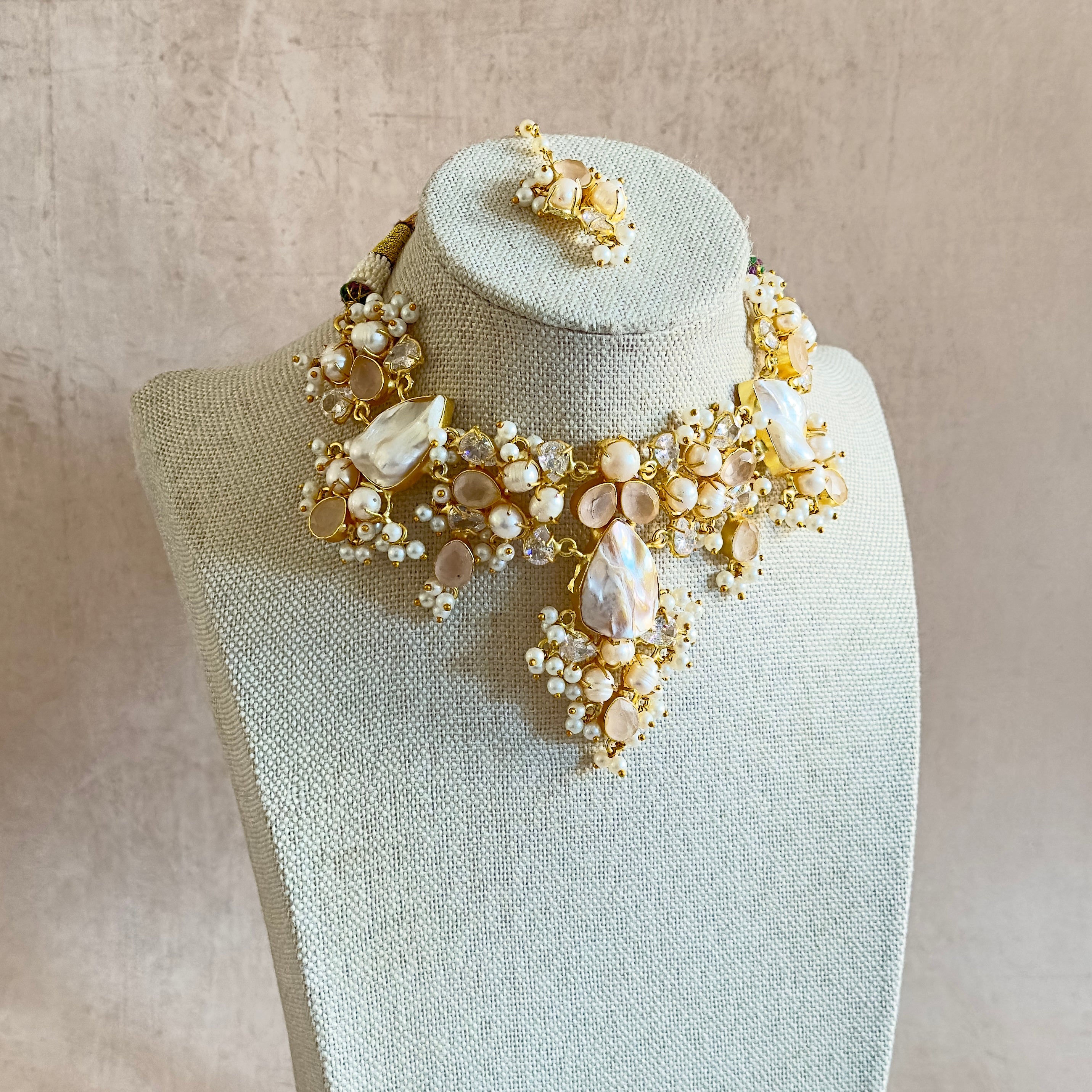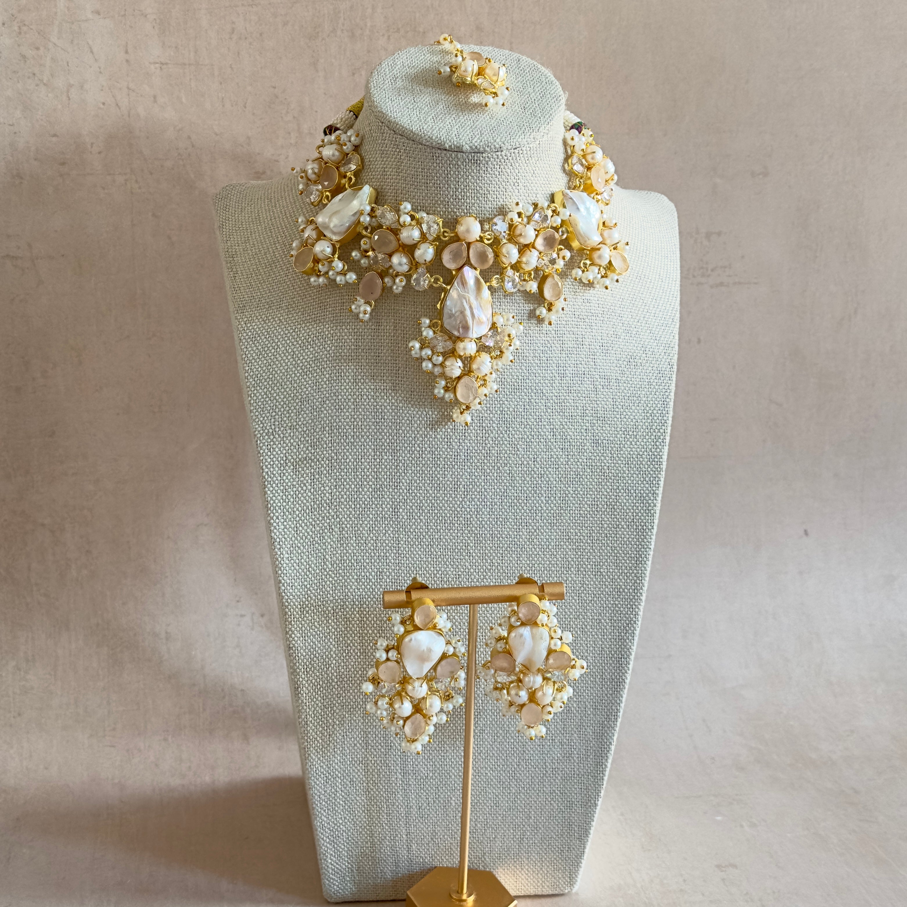 Elevate your elegance with the Antonia Rose Pearl Choker Set, featuring luminous rose quartz and unique baroque pearls accented by sparkling cubic zirconia crystals. This sophisticated set includes matching stud earrings and a delicate tikka, perfect for adding a refined touch your ensemble.