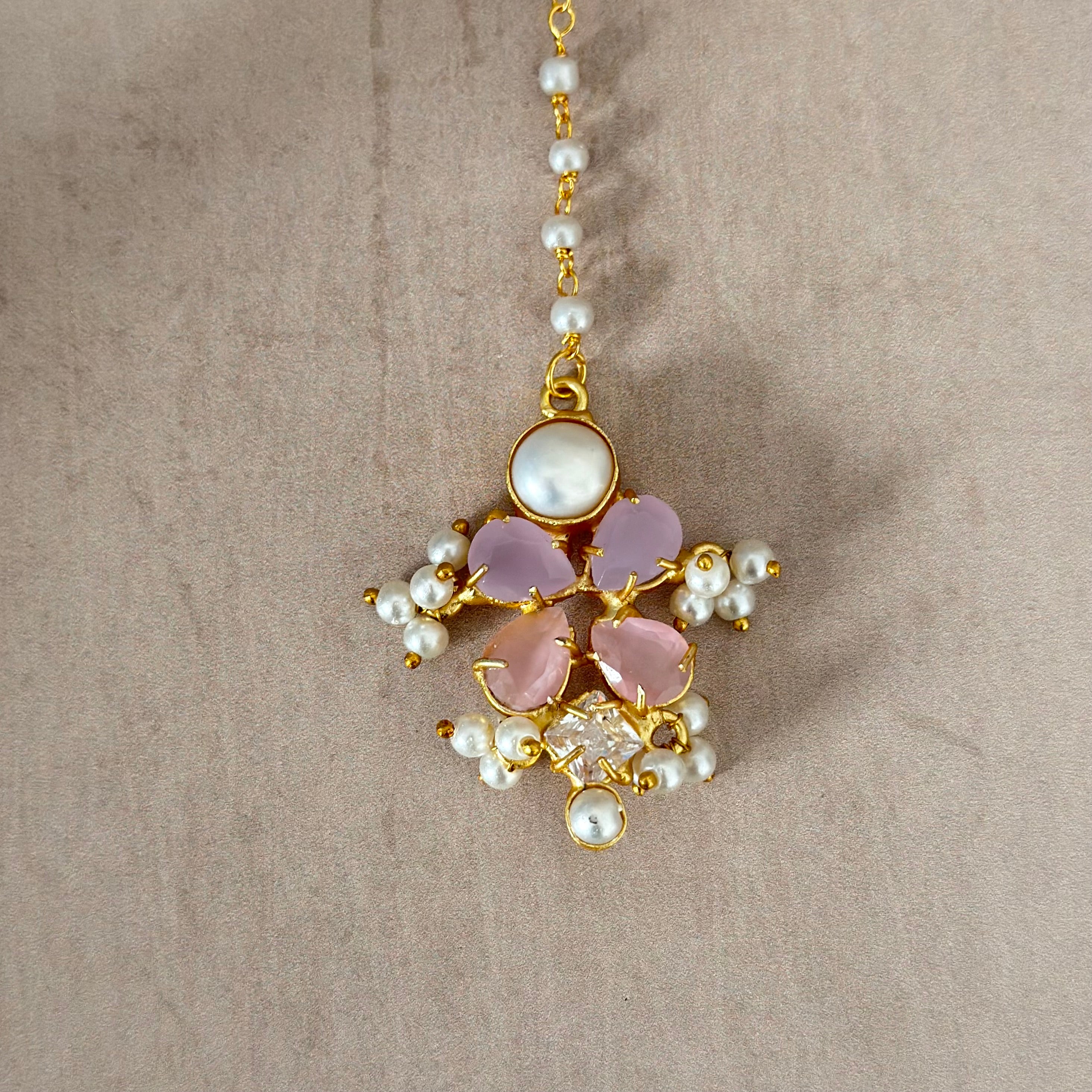 Make a striking impression with the Areeba Pink Lilac Choker Set, a luxurious three piece ensemble designed to elevate any occasion. This statement choker features soft delicate hues, adorned with lustrous pearls and sparkling cubic zirconia crystals that catch the light beautifully. The set includes matching drop earrings and an elegant tikka, creating a sophisticated look. Perfect for formal occasions.