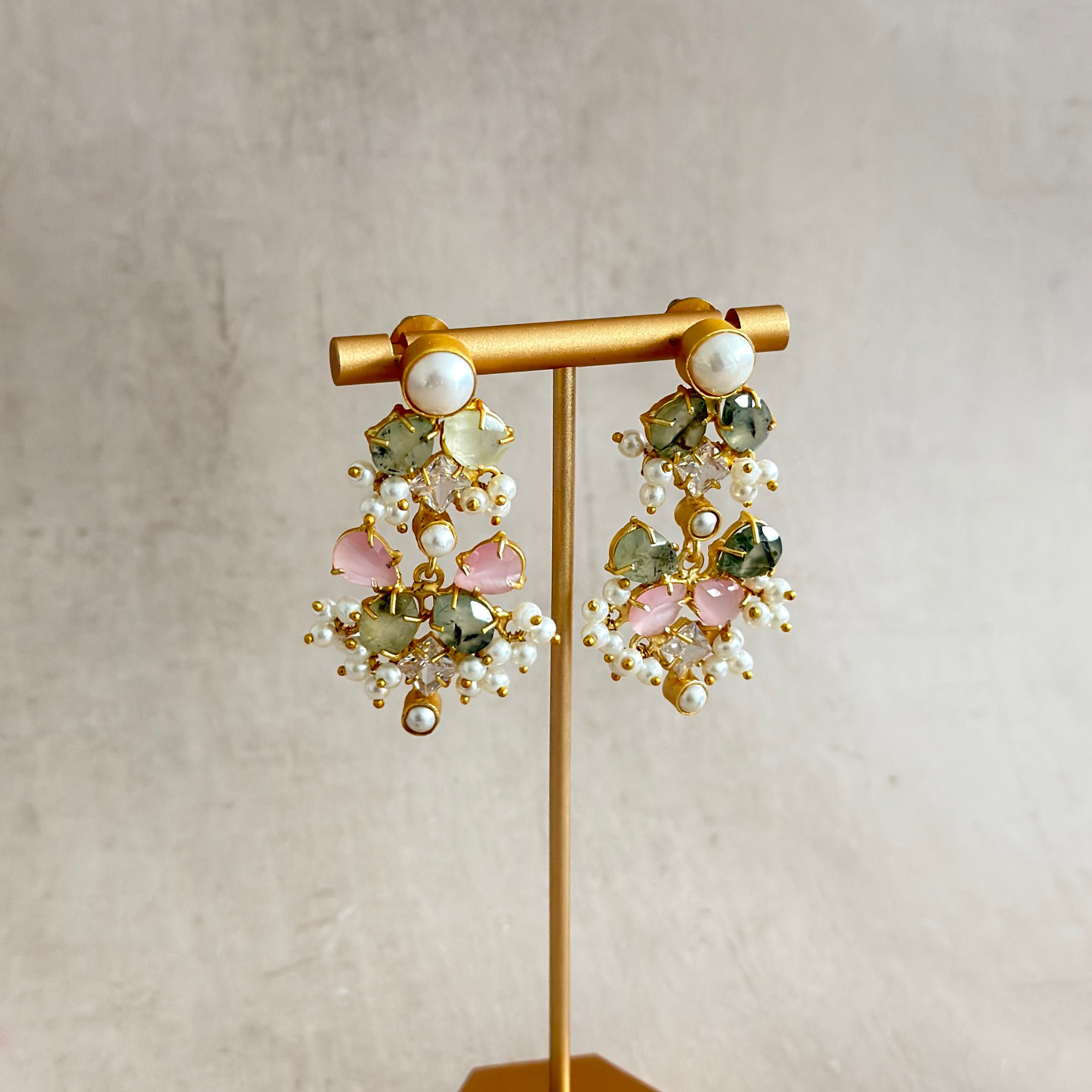 Make a striking impression with the Areeba Olive Pink Choker Set, a luxurious three piece ensemble designed to elevate any occasion. This statement choker features soft pink hues complemented by serene prehnite stone, adorned with lustrous pearls and sparkling cubic zirconia crystals that catch the light beautifully. The set includes matching drop earrings and an elegant tikka, creating a sophisticated look. Perfect for formal occasions.