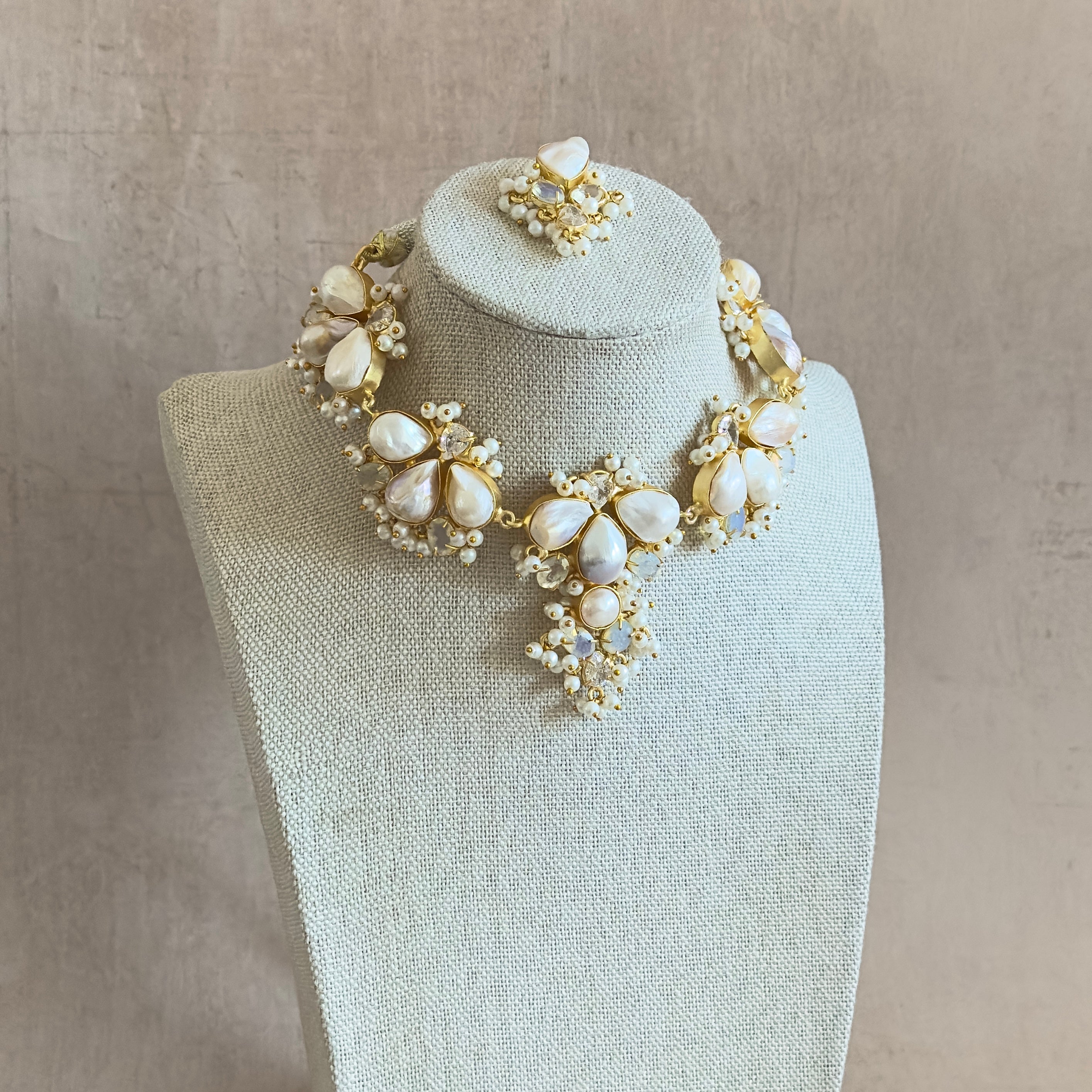 The Inaya Crystal Pearl Choker Necklace Set showcases the natural beauty of baroque pearls combined with the ethereal glow of opalite stones. This stunning set includes a choker, matching drop earrings, and a tikka, creating a harmonious look. Perfect for special occasions, it adds a touch of sophistication and charm, making you stand out with a unique blend of classic and contemporary style.