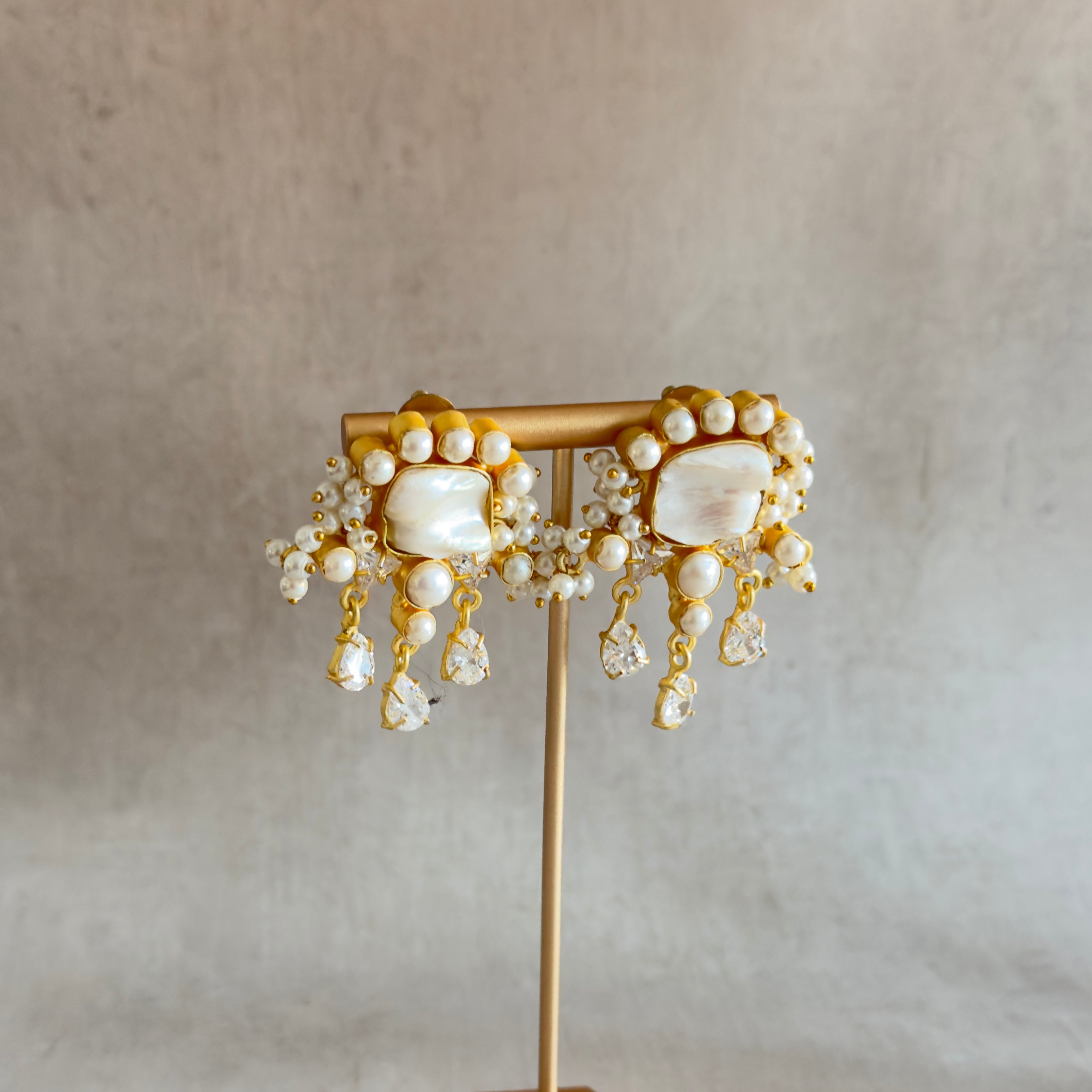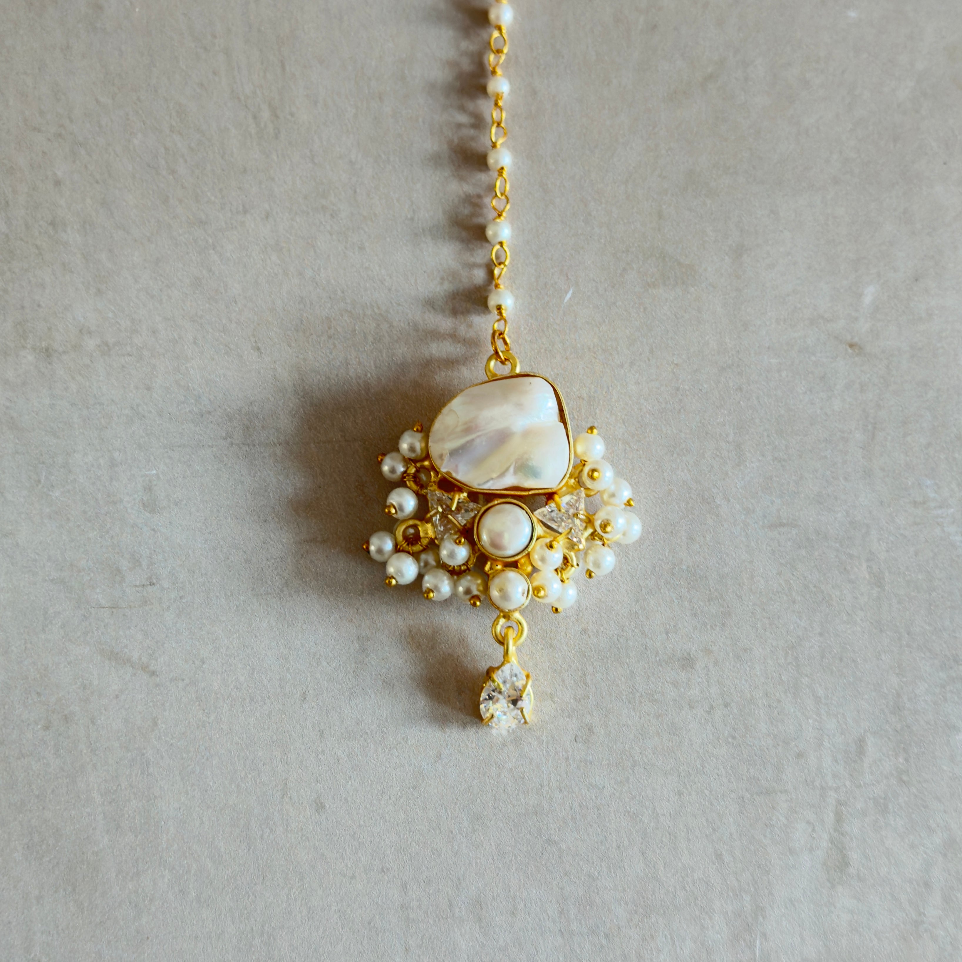 Elevate your look with the Khawla Pearl Choker Set, a stunning three piece jewellery set designed to turn heads. This exquisite set features a choker adorned with lustrous baroque pearls and shimmering cubic zirconia crystals, that catch the light beautifully. Paired with matching stud earrings and a tikka, this statement choker set offers effortless glamour, perfect  for weddings, celebrations, and special occasions.