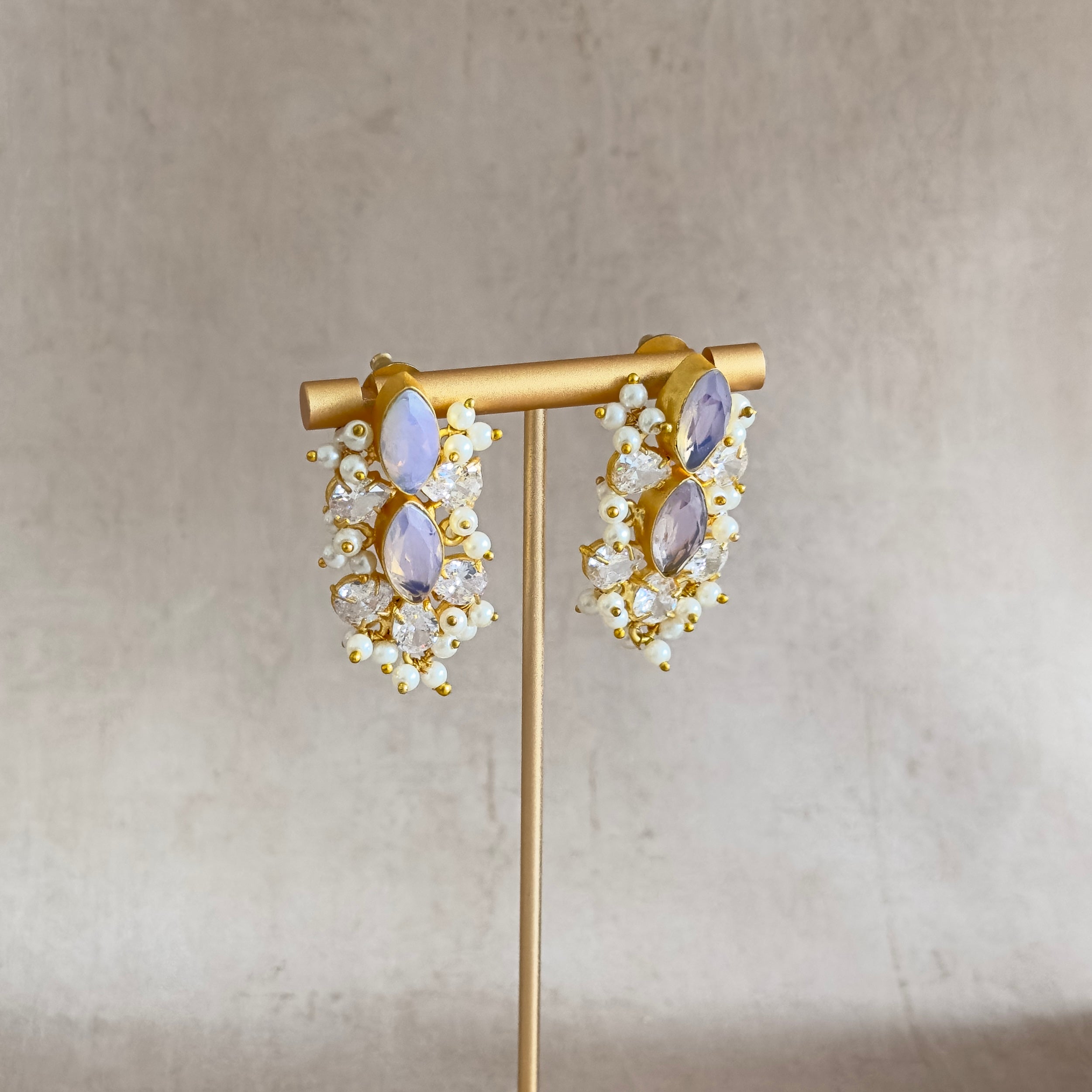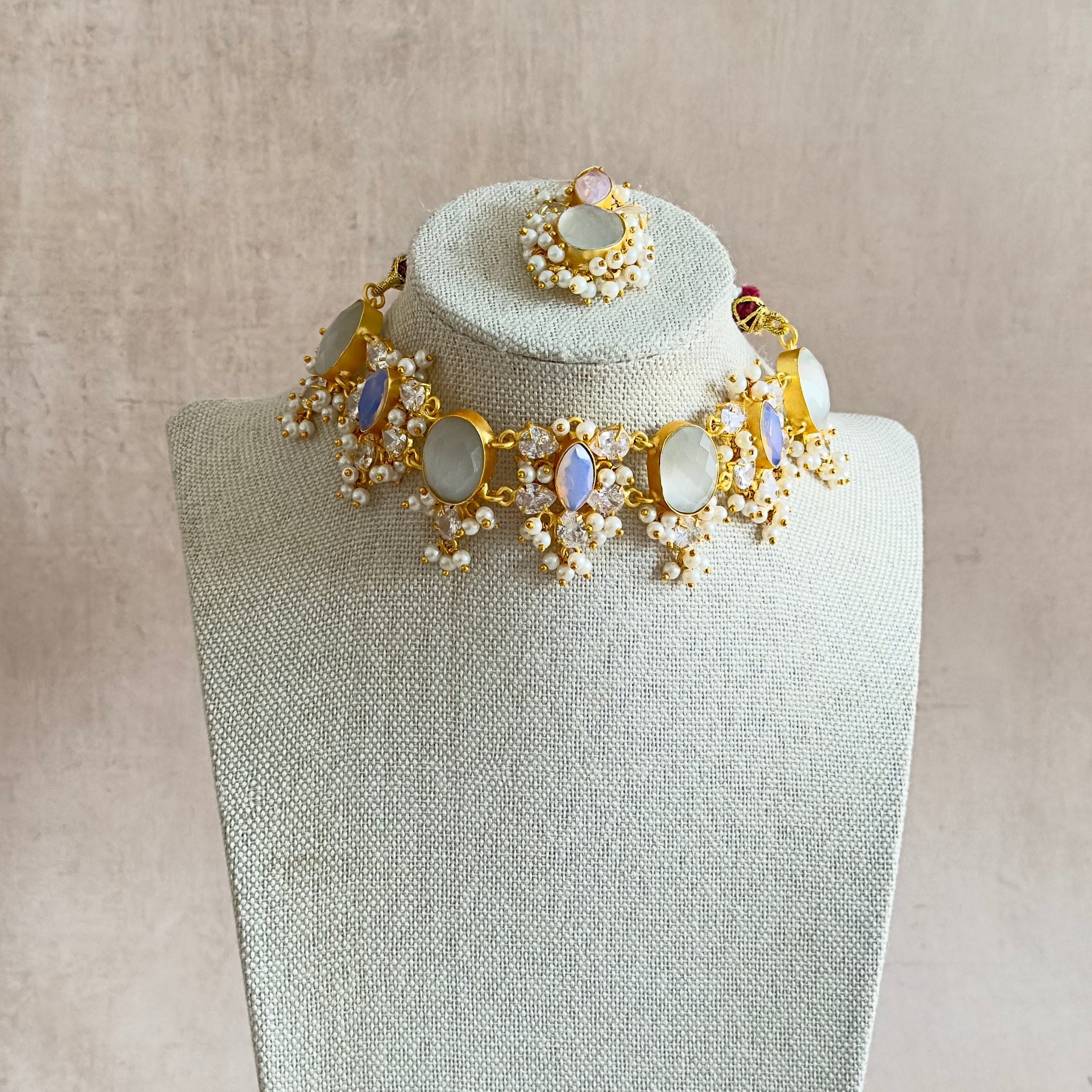 The Lauretta Grey Crystal Choker Set features hand-cut grey and opalite stones, expertly crafted to create a harmonious blend of subtle shimmer and sophistication. This matching ensemble includes stud earrings and a traditional tikka, designed to complement each other perfectly.