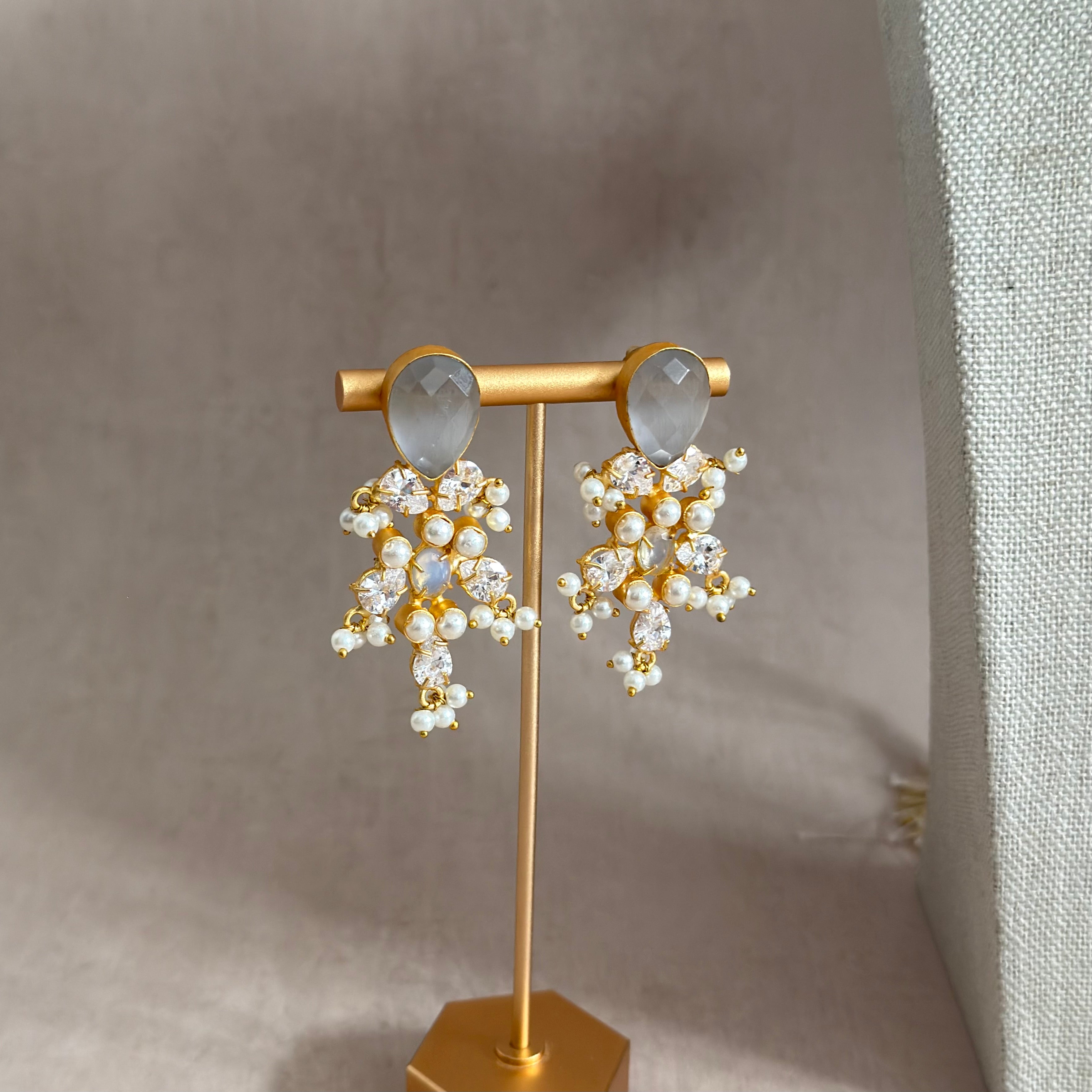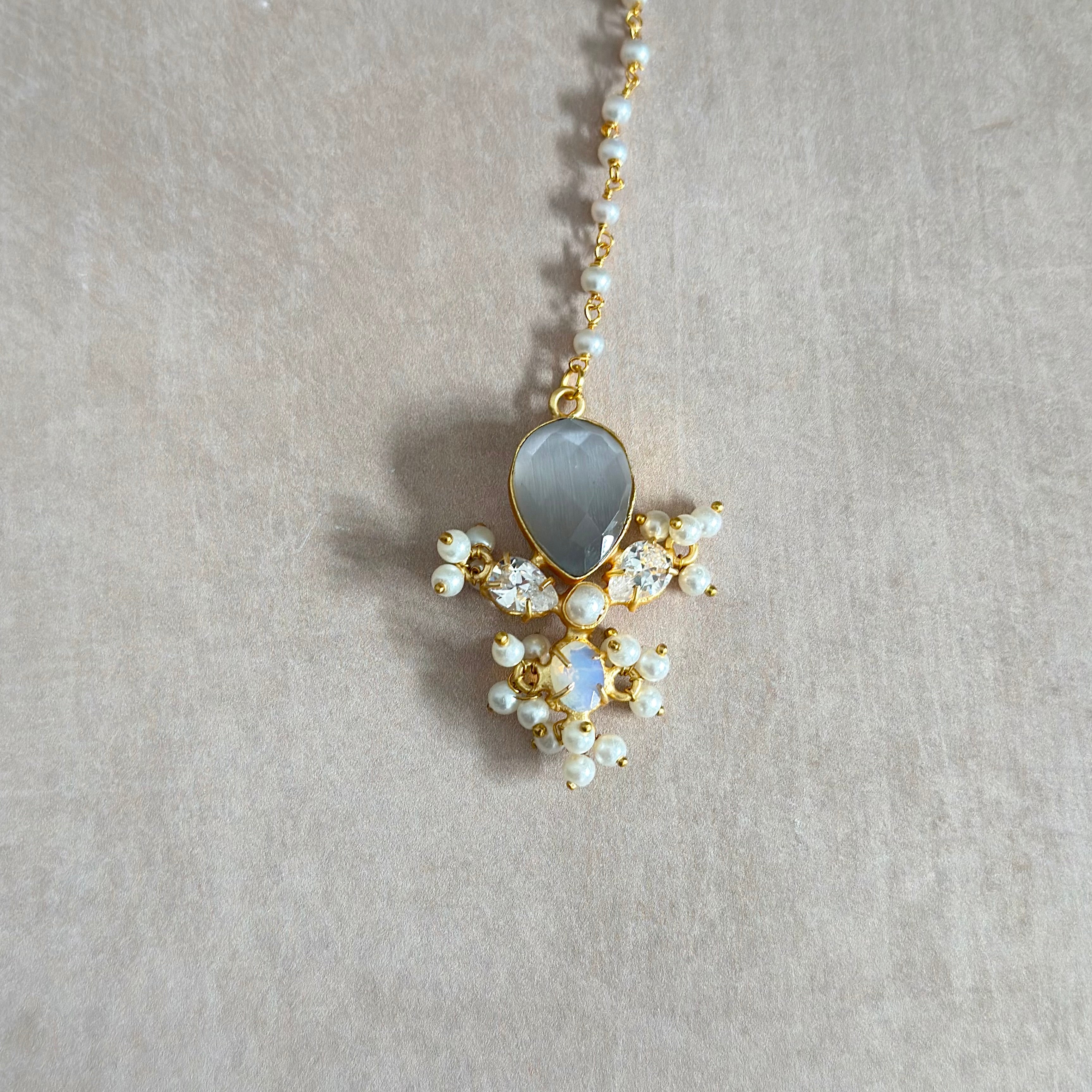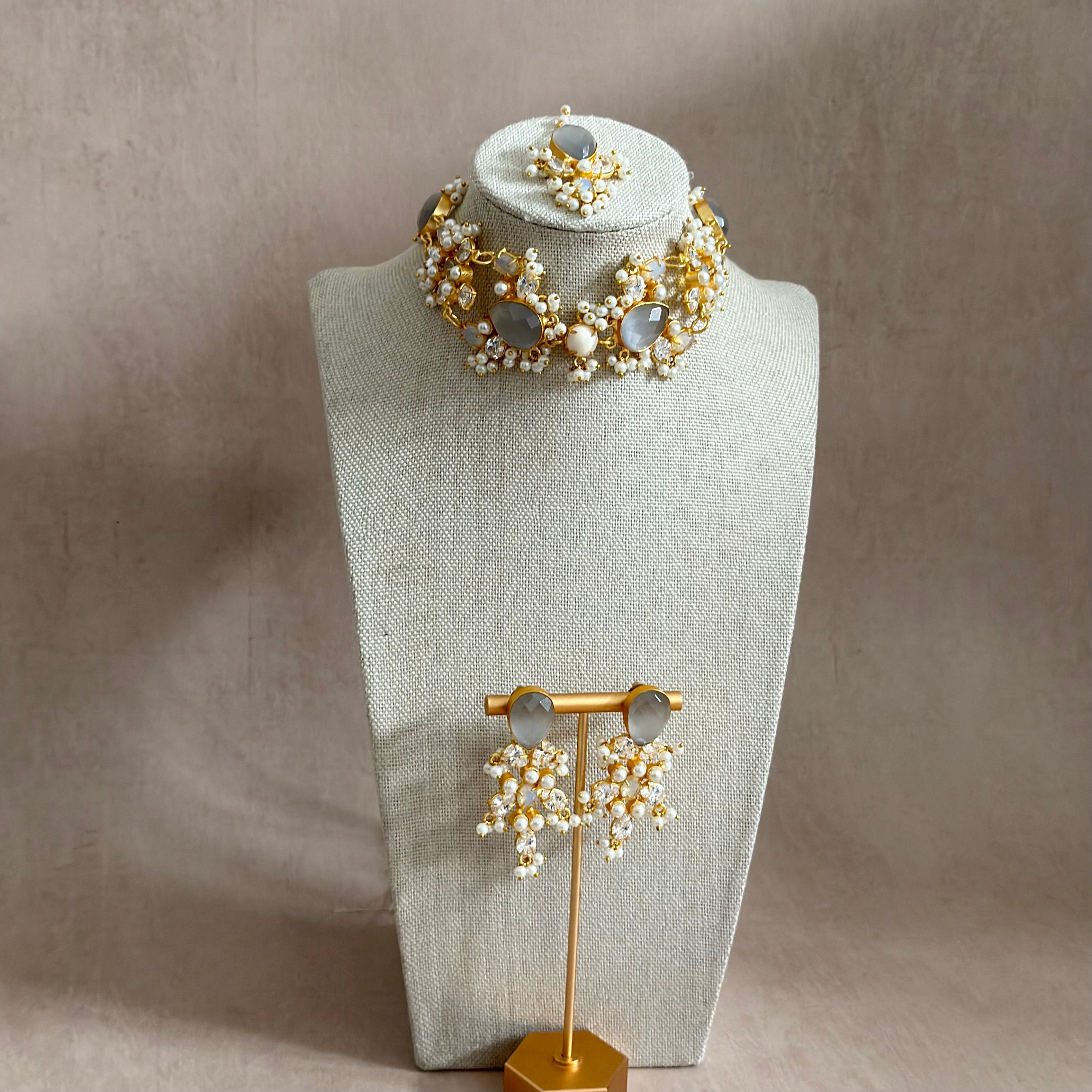 Elevate your look with the Maria Grey Choker Set. Adorned with grey and opalite stone, pearl accents, and cubic zirconia crystals, this set adds an elegant touch to any outfit. Complete with the matching earrings and tikka. Perfect for special occasions.
