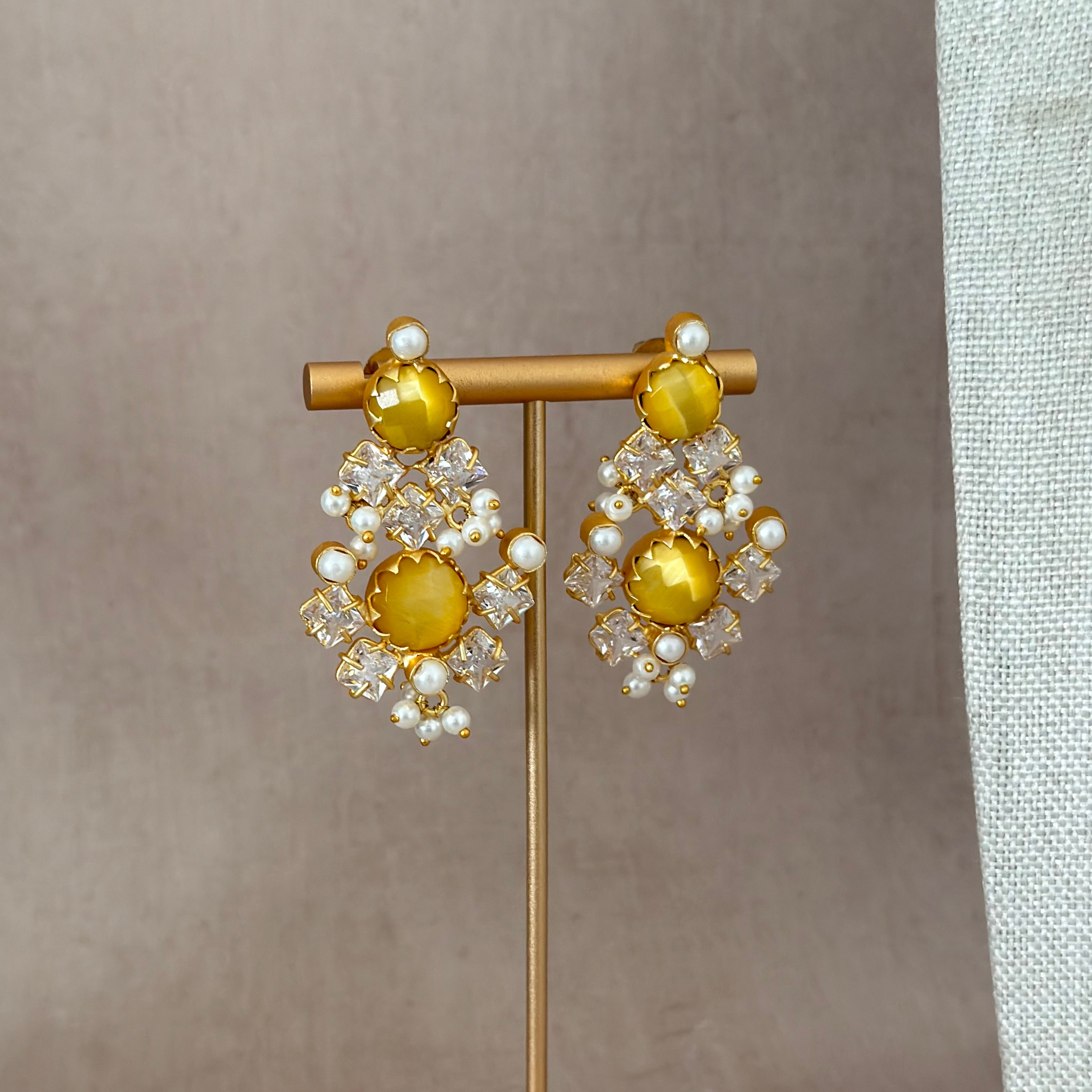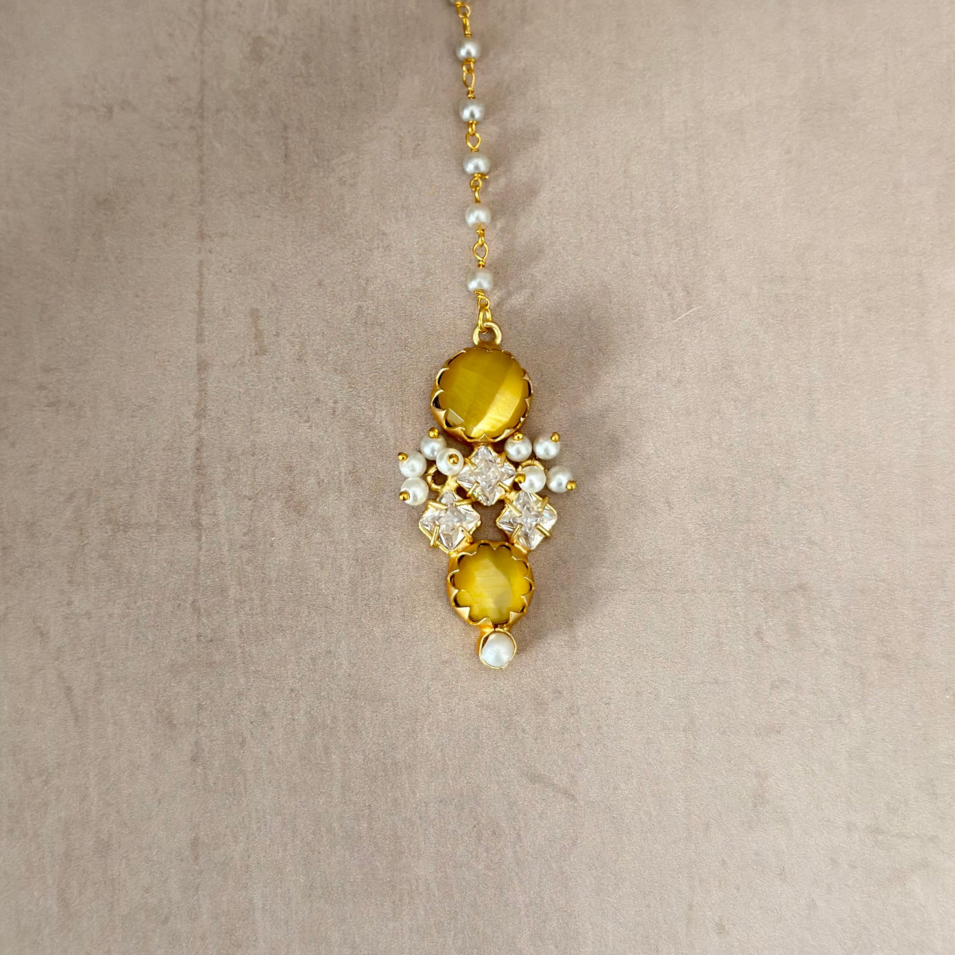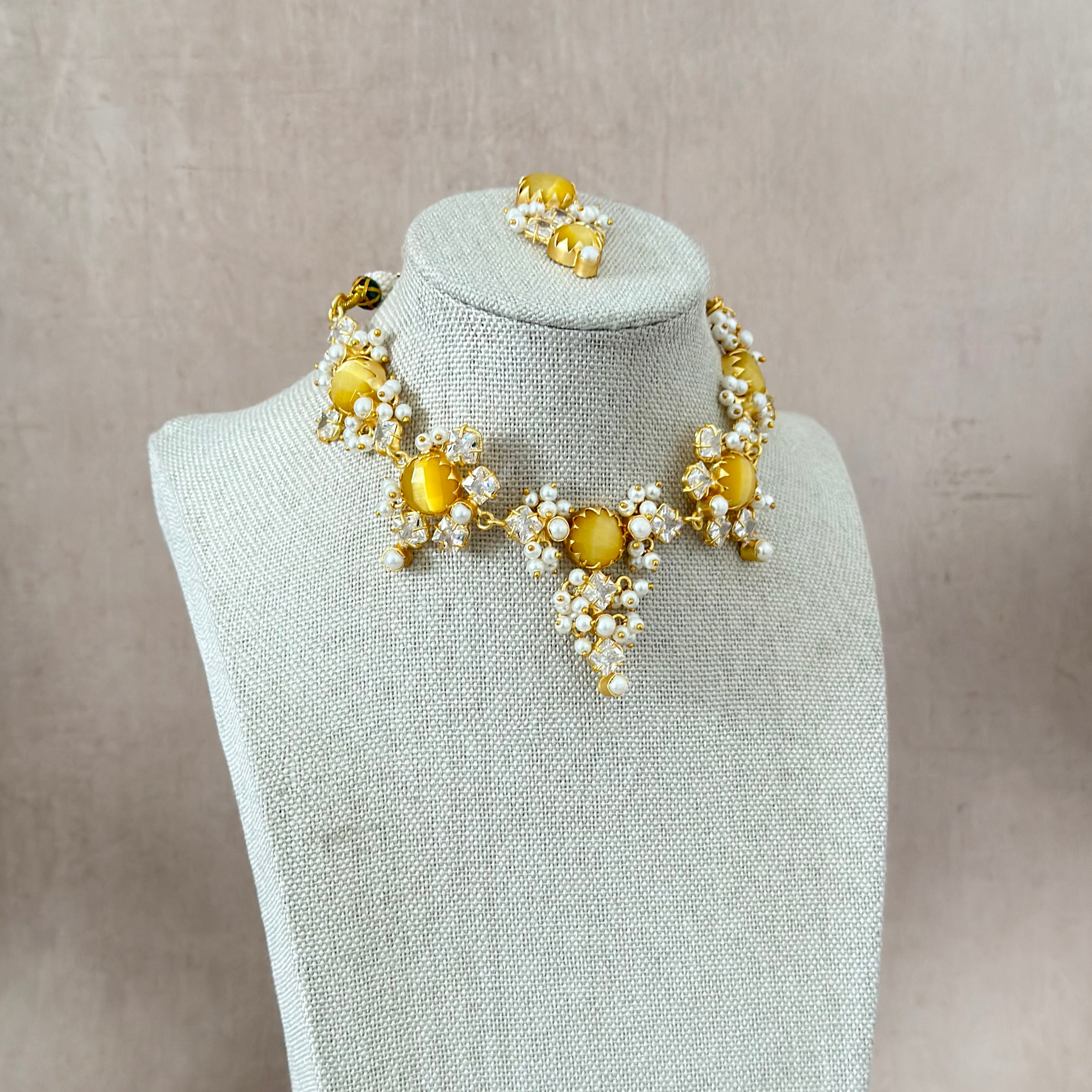 The Miah Lemon Choker Set features a beautiful yellow monalisa stones paired with sparkling cubic zirconia crystals. This elegant choker adds instant glamour to any look, with its warm golden tones and brilliant sparkle. Perfect for special occasions.