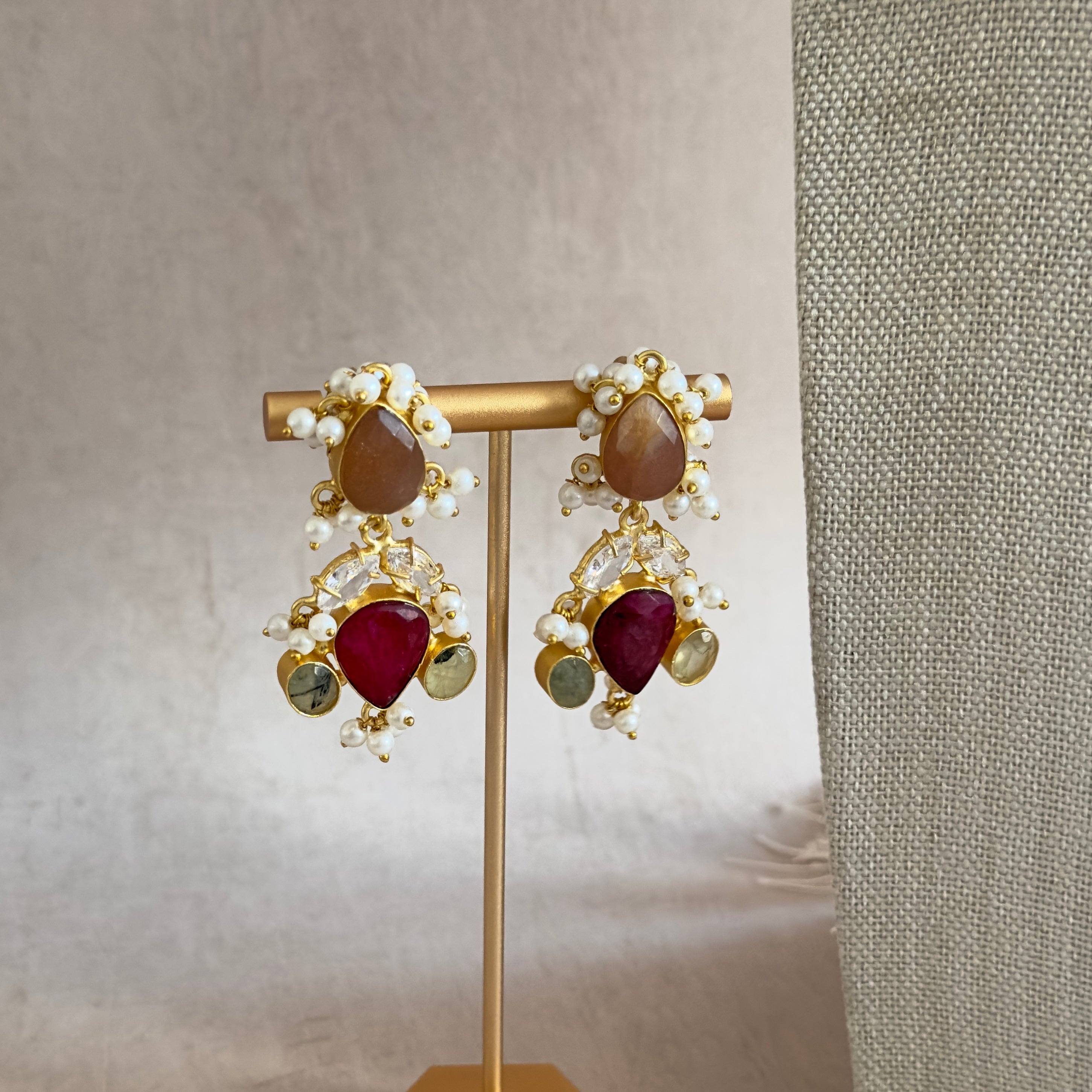 The Nawal Crystal Choker Set features a harmonious blend of warm peach moonstone, vibrant ruby corundum, and soft prehnite hues. This elegant set includes a beautifully crafted choker paired with matching drop earrings and a delicate tikka, perfect for adding a refined touch to any sophisticated ensemble. Each piece enhances natural radiance while offering a timeless statement of grace. Perfect for any formal occasion.