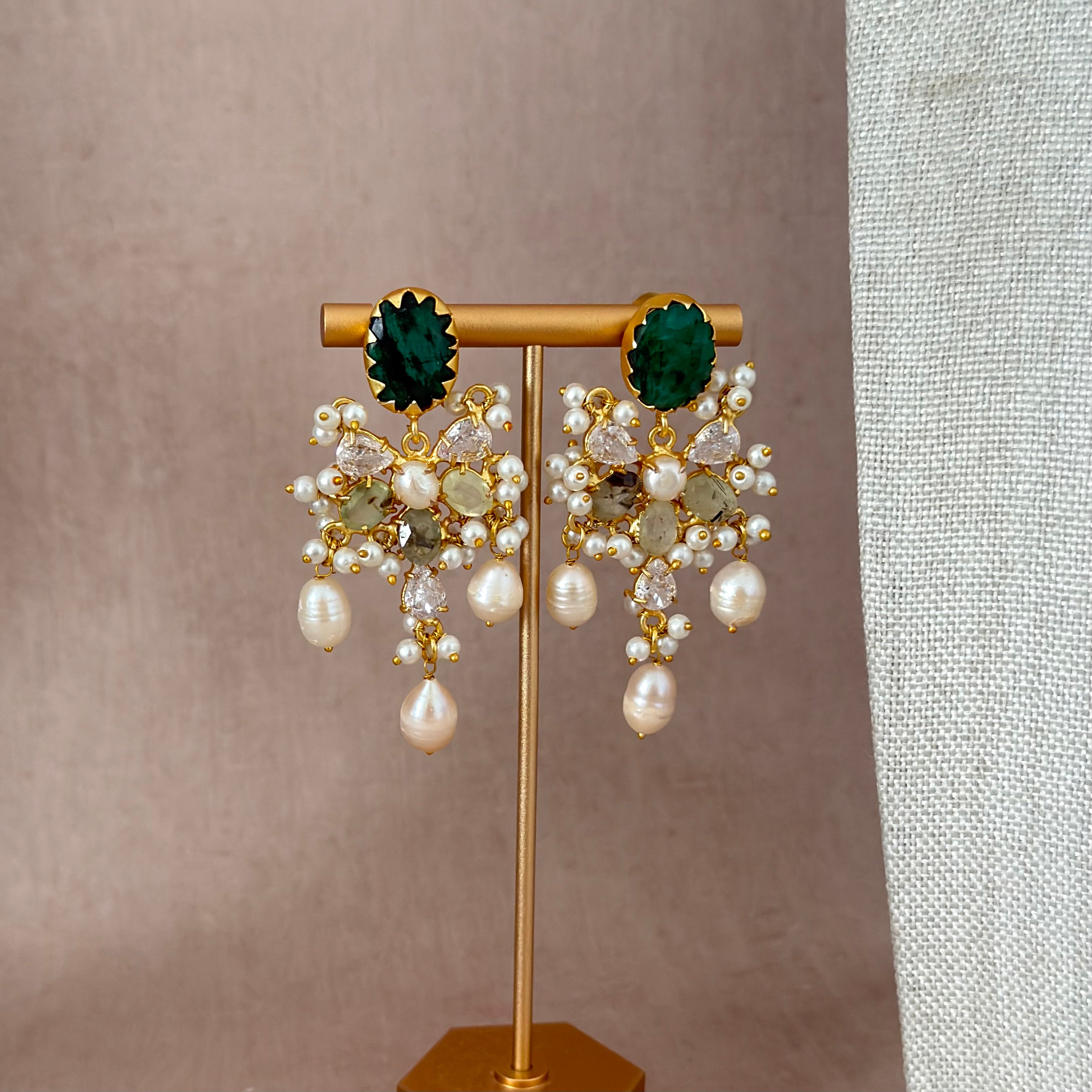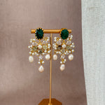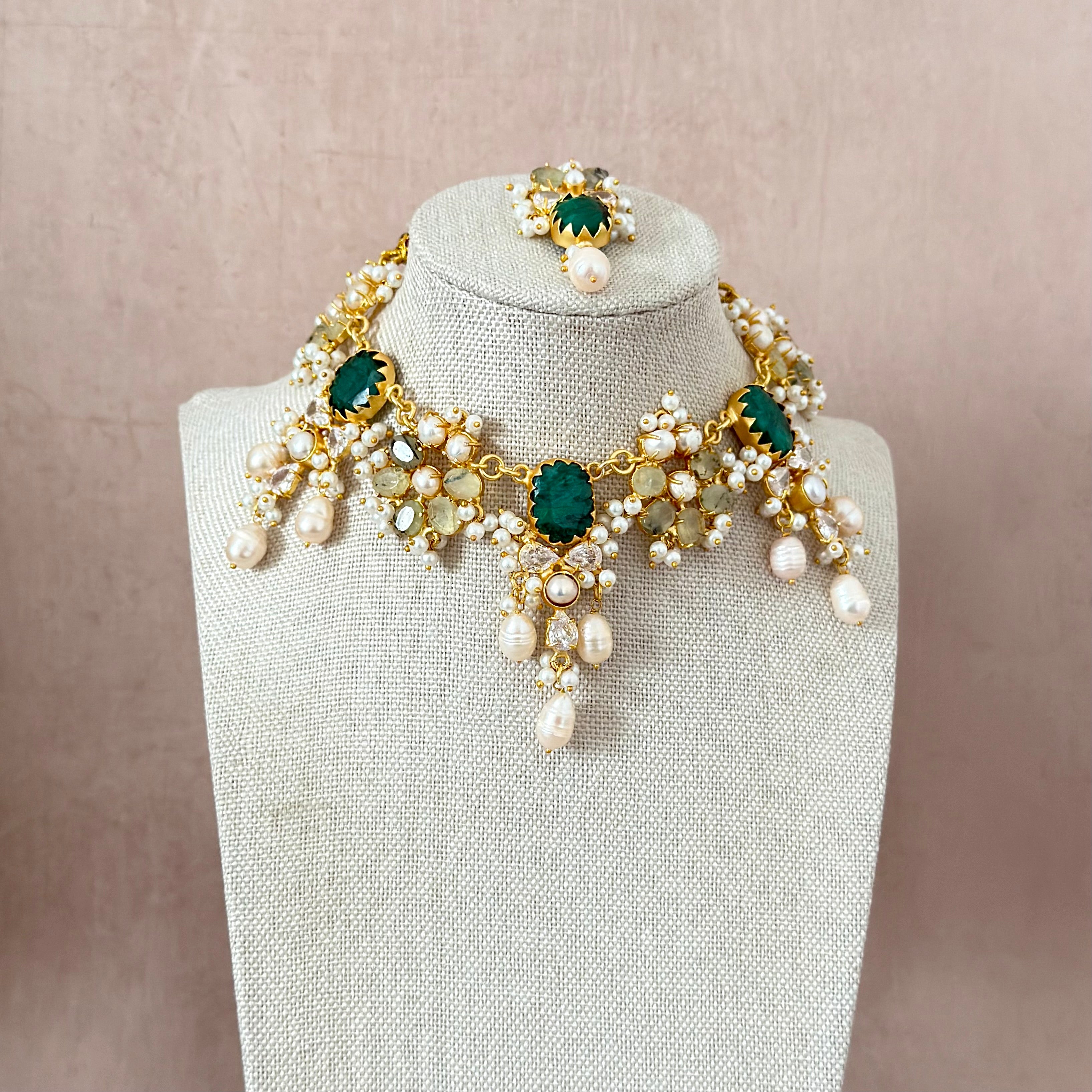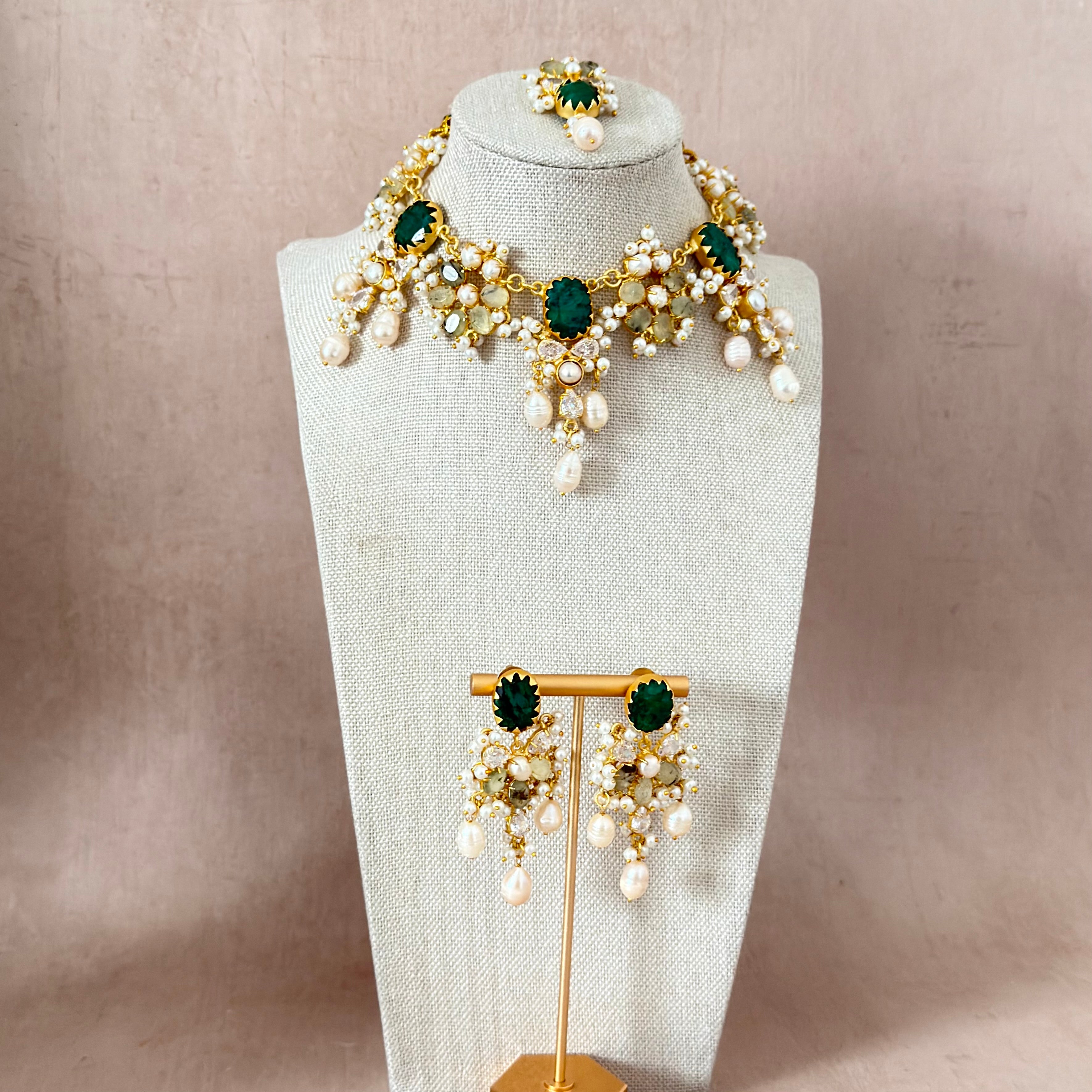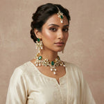 The Ria Green Pearl Necklace Set brings together pearls, green corundum, and prehnite stone in one cohesive design. This three-piece ensemble features a striking statement necklace paired with coordinating drop earrings and a tikka, creating a complete look that works beautifully for formal occasions. Discover our new jewellery that combines natural beauty with understated sophistication.